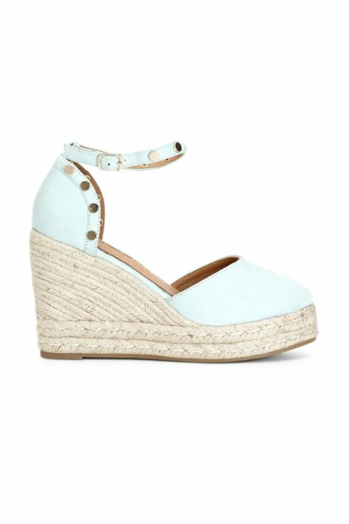 Sandali su zeppa in corda con cinturino alla caviglia in tessuto chiuso davanti e dietro con borchie dorate.
