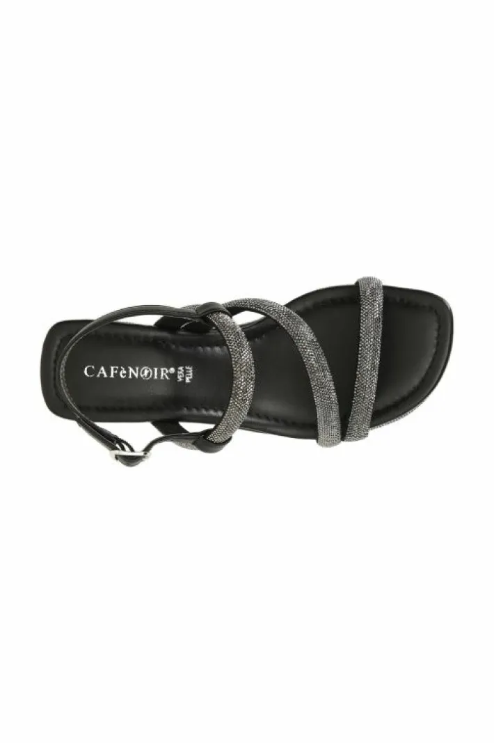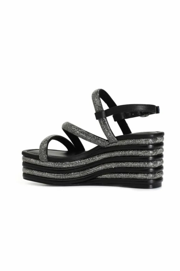 Sandali con fasce con strass. zeppa caratterizzata da fasce di strass alternati. il comodo soletto imbottito in vera pelle fa risultare la calzatura comoda anche dopo svariate ore di utilizzo. il tacco è alto 70mm il plateau invece è di 35mm.