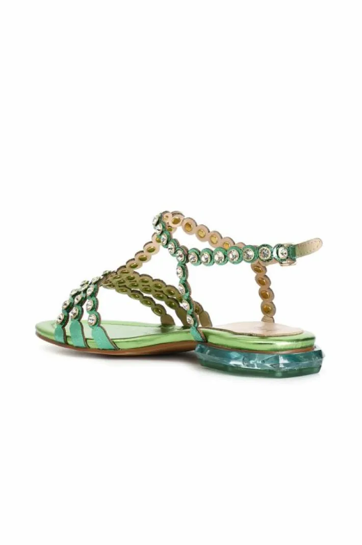 Sandali a “t” con multilistini e strass. la forma particolare del tacco rende la calzatura super chic e super glamour. c…