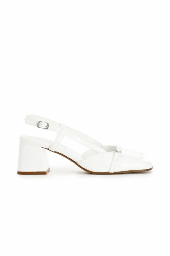 Scarpe aperte in vernice con bordo effetto mocassino e fibbia gioiello. calzatura dalla forma arrotondata. un mix tra un mocassino e una décolleté. laccio sul dietro. tacco alto 45mm. molto comoda perfetta per l’uso quotidiano.