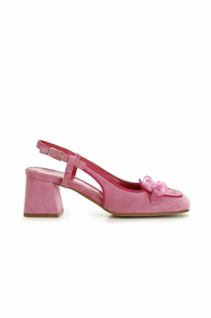 Scarpe in suede realizzate in camoscio aperte sul retro con morsetto trasparente effetto satin. tacco da 5 cm fasciato c…
