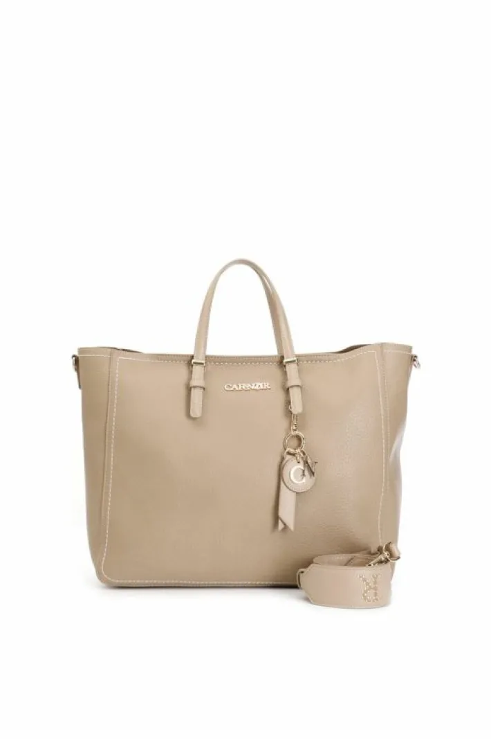 Shopping dalla struttura morbida sfoderata con charms e tracolla removibile logata con rivetti. unico scomparto e taschino interno di 200 mm aperto. chiusura con cerniera.