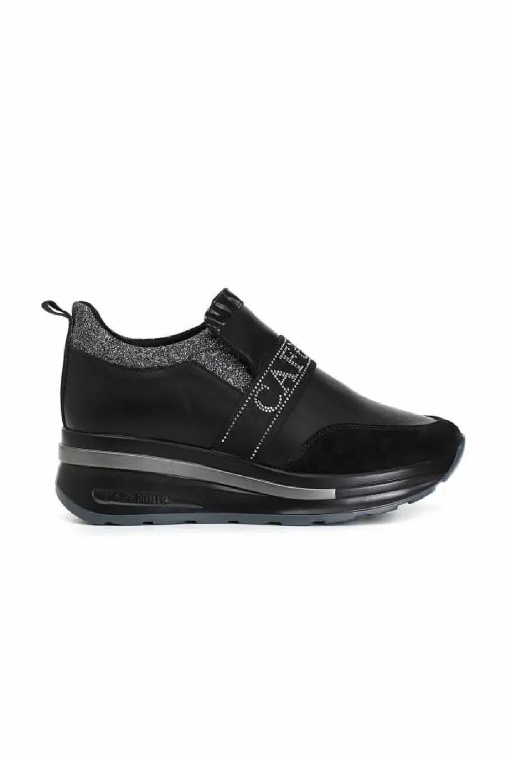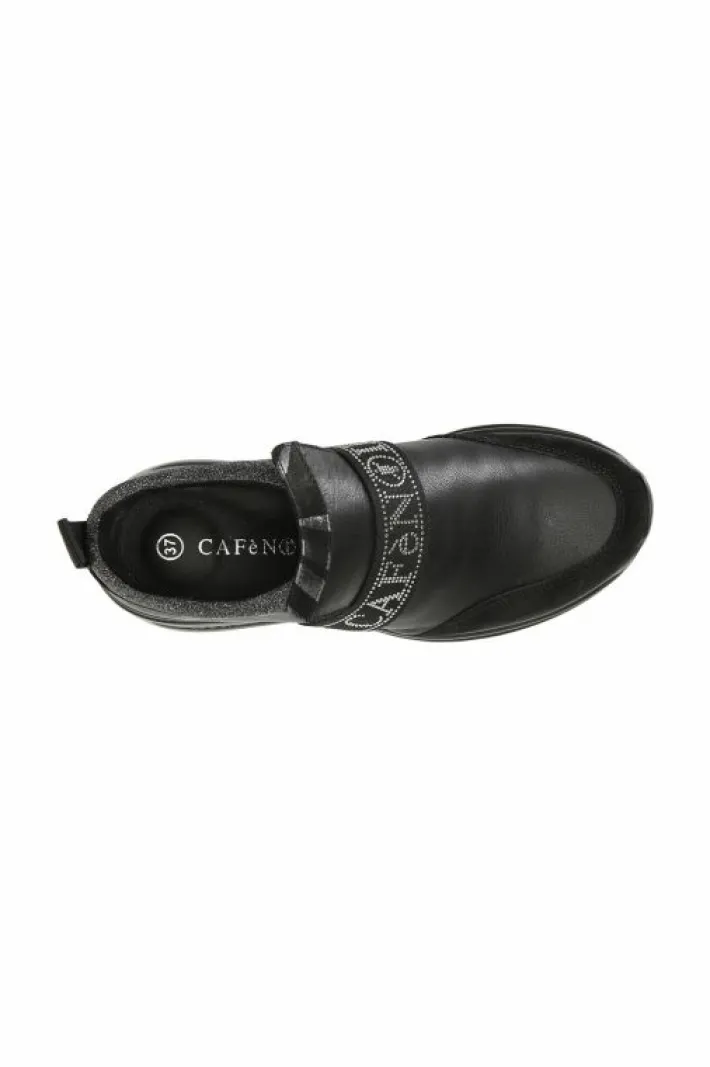 Slip-on da donna in pelle arricchita da dettagli glitterati e graziosa fascia con logo cafènoir in strass. suola rialzata bicolor con logo embossed.