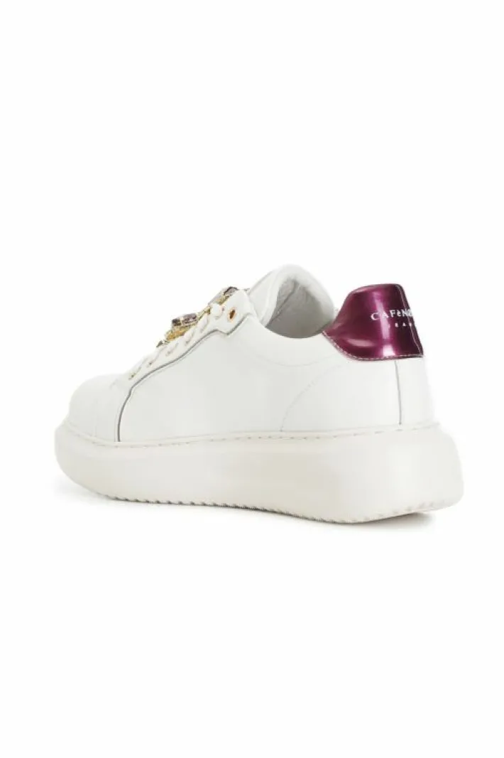 Sneakers da donna allacciate realizzate in morbida pelle. calzatura decorata con accessori gioiello removibili diversa tra destra e sinistra. tallone con dettagli in laminato. tomaia e sottopiede in pelle. fussbett interno. punta tonda. altezza suola 40mm.