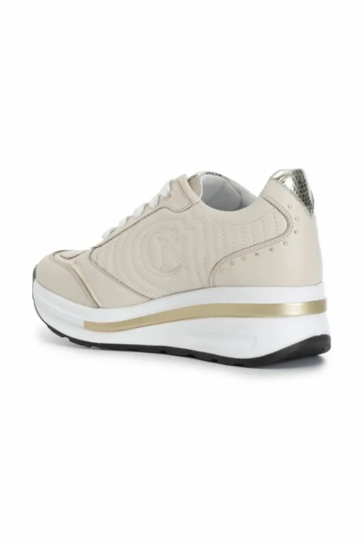 Sneakers in pelle con particolare ricamo imbottito. il logo è ricamato nella parte laterale della tomaia. inserti laminati e microborche sul tallone. suola rialzata bicolor con logo embossed