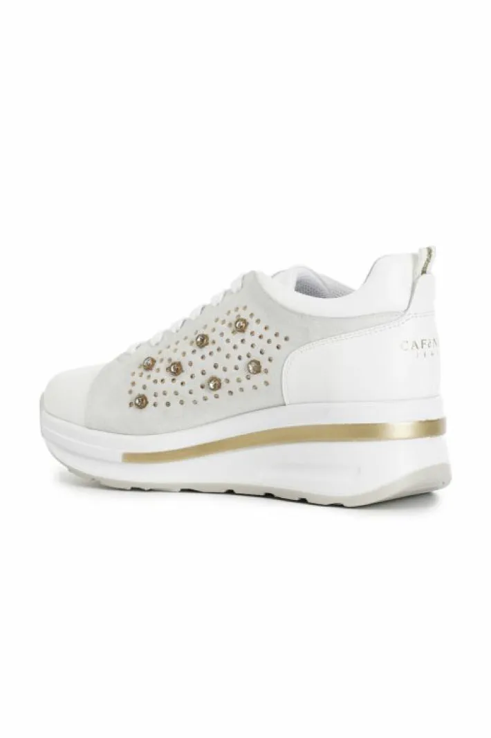 Sneakers in pelle scamosciata con riporti in pelle e motivo di borchie e strass. suola con zeppa bicolor di 40mm con logo embossed.