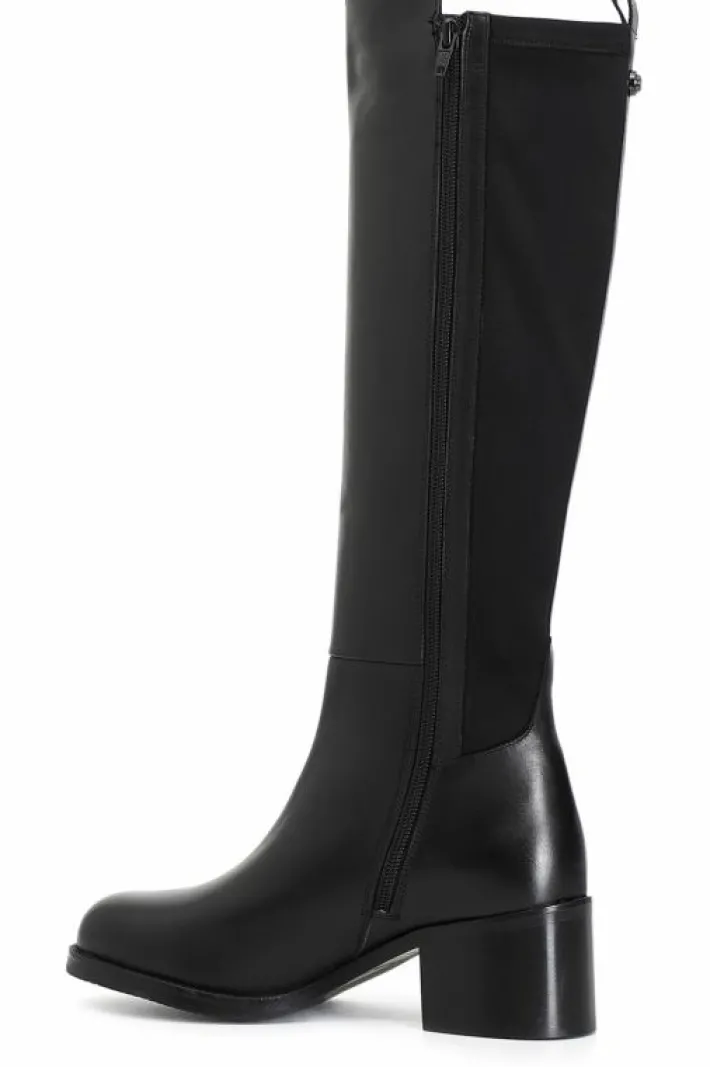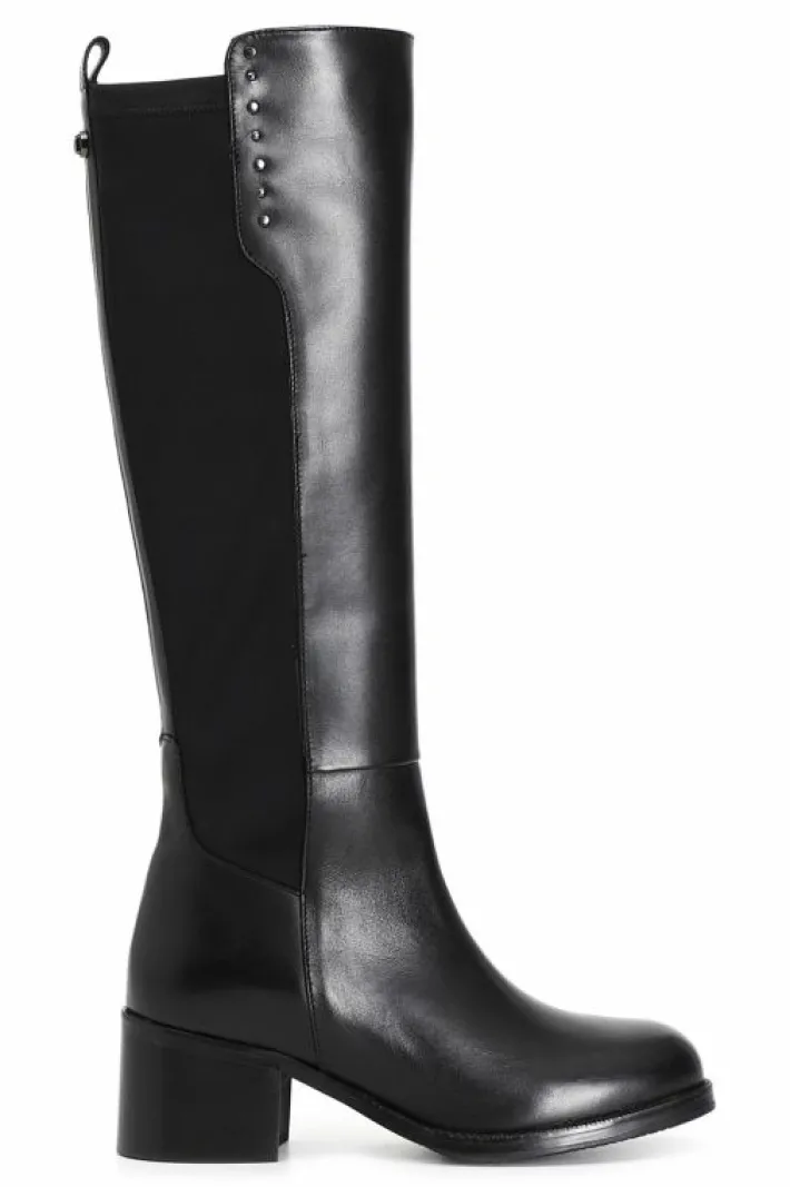 Stivale da donna in pelle e stretch arricchito da borchie. il tacco è alto 50mm e il soletto è in pelle.