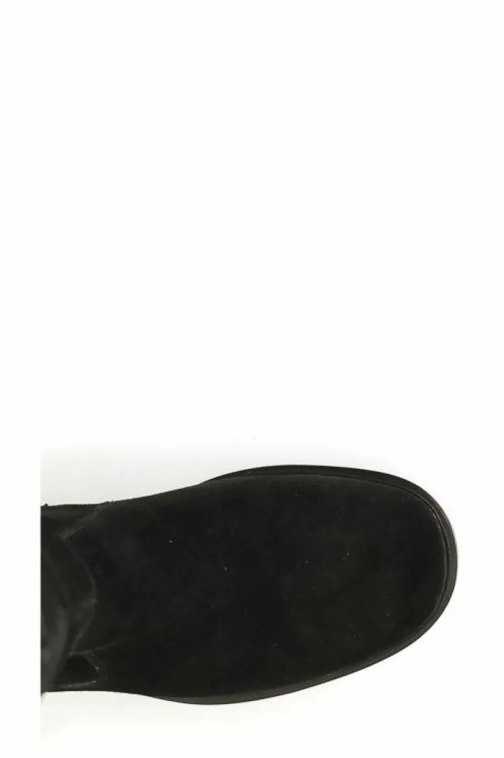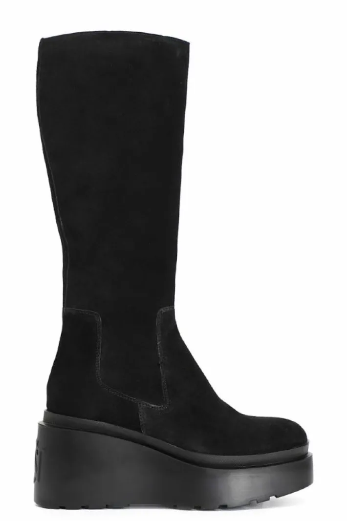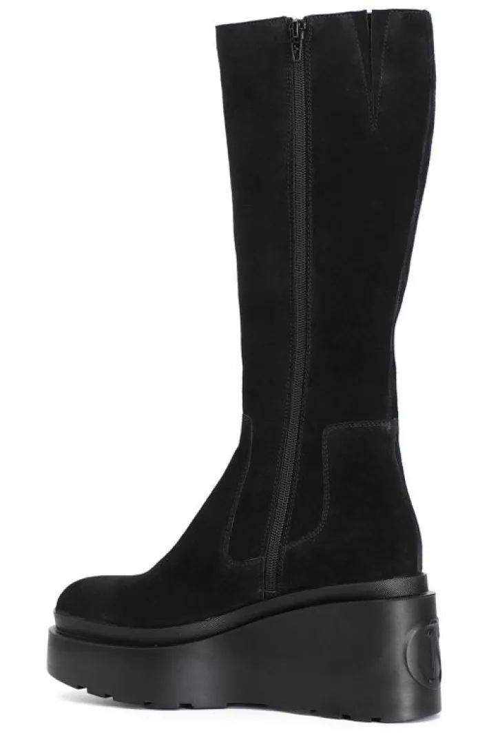 Stivale in pelle scamosciata con pleteau e tacco. soletto in pelle e suola con zeppa personalizzata con logo a rilievo sul retro.