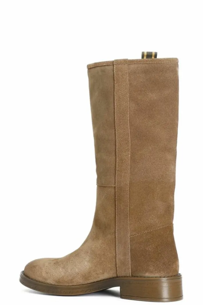 Stivale modello cavaliere in pelle scamosciata dalla forma arrotondata. tacco alto 33 mm. il soletto è in pelle.