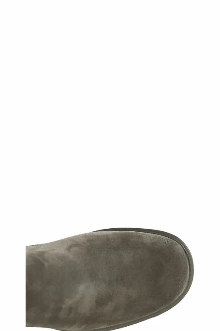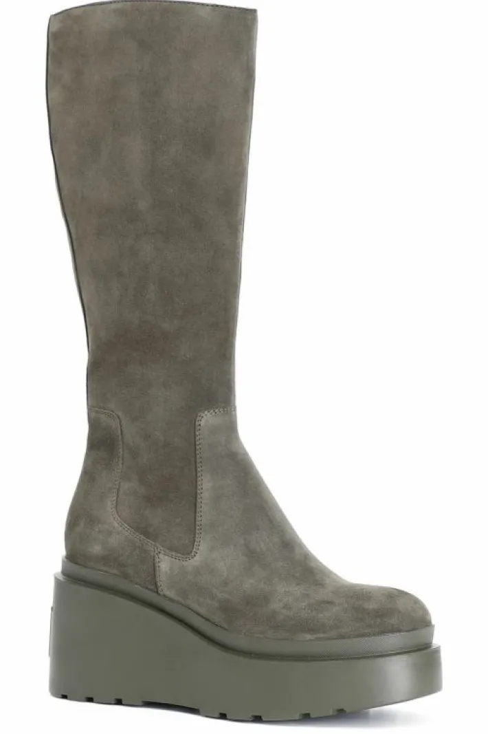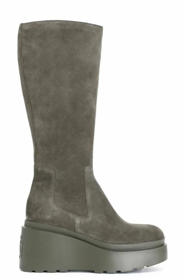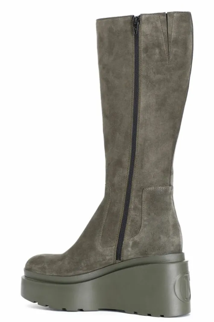 Stivale in pelle scamosciata con pleteau e tacco. soletto in pelle e suola con zeppa personalizzata con logo a rilievo sul retro.