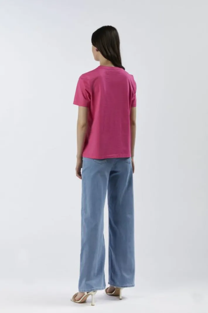 T-shirt basica girocollo a maniche corte realizzata in jersey di cotone. la t-shirt ha la riproduzione del nostro slogan “be a flower” realizzato con stampa e applicazioni di strass color mango.