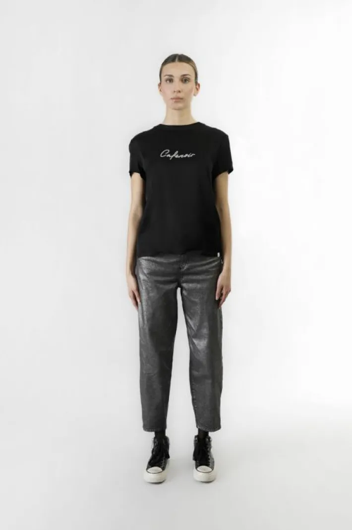 T-shirt bimateriale dalla manica corta . il davanti della t-shirt e le maniche è realizzata in satin di viscosa con stampa del nostro logo con stampa effetto glitter. il dietro è in jersey di viscosa.
