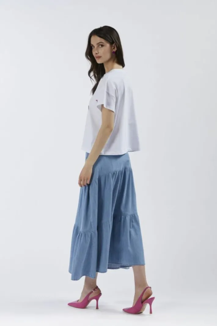 T-shirt a maniche corte realizzata in jersey di cotone. applicazioni di fiori e foglie fatte di strass sul davanti e all…