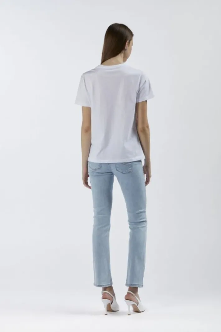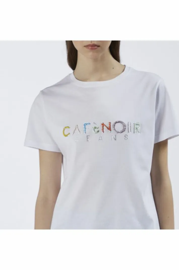 T-shirt a maniche corte realizzata in jersey di cotone. logo cafènoir ricamato da perline di diversi colori pastello.