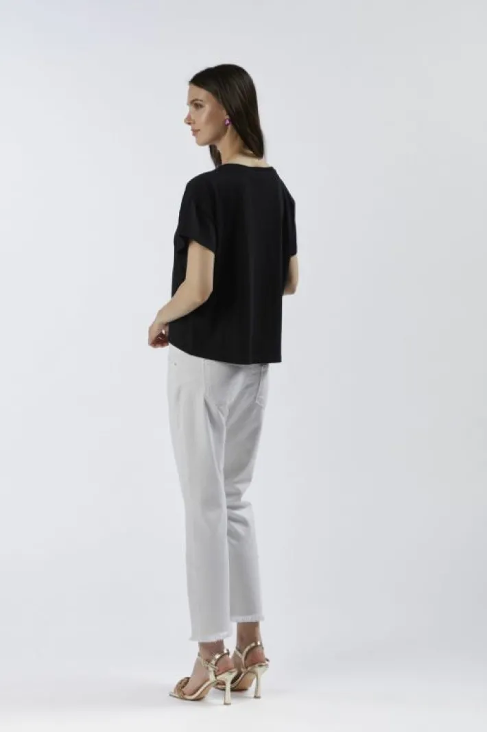 T-shirt cropped girocollo a maniche corte realizzata in jersey di cotone. la t-shirt ha la riproduzione del nostro sloga…