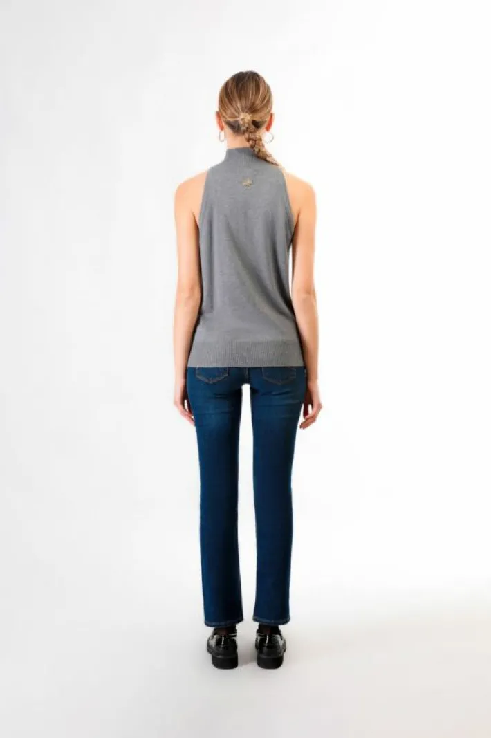 Top smanicato con colletto alto realizzata in filato misto cashmere. perfetto per essere indossato con qualunque abbinamento.