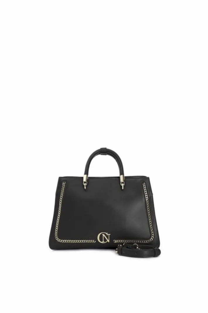 Tote con applicazione di catena in metallo dorato e logo cafènoir. manico doppio imbottito. doppio scomparto e doppia c…