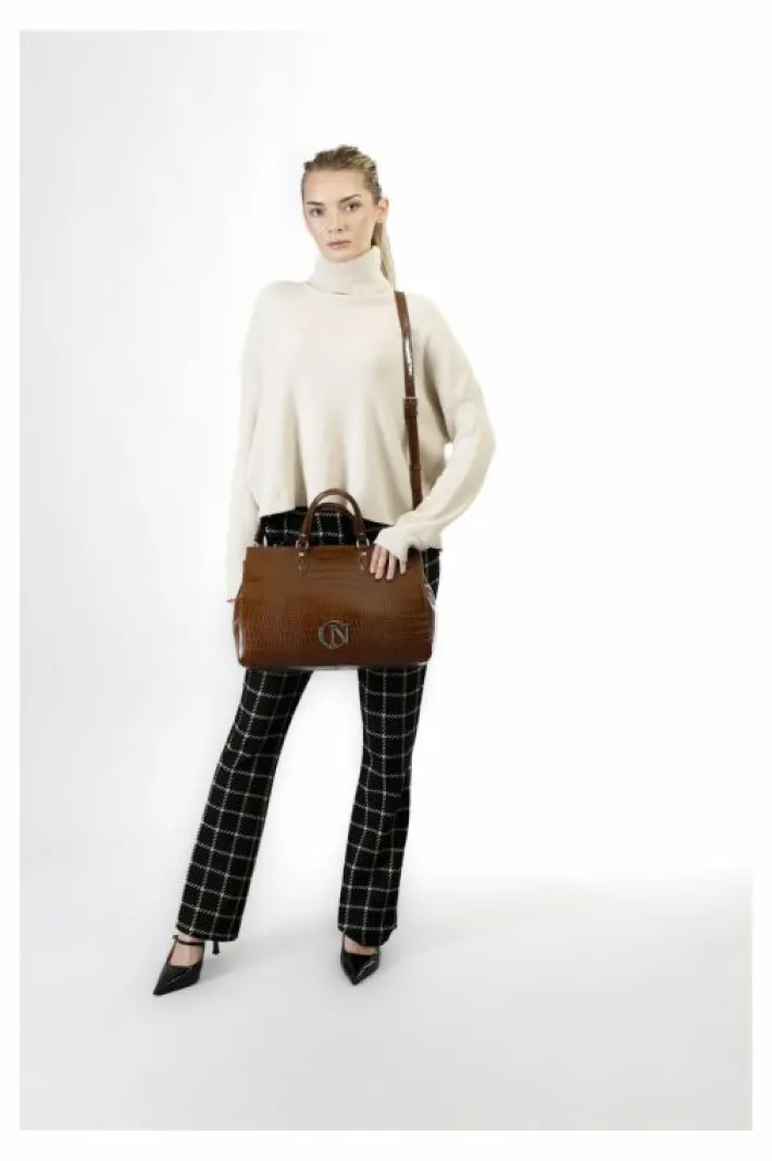 Tote rigida realizzata con stampa coccodrillo. logo cafènoir in metallo. tracolla removibile per un look da giorno più sofisticato