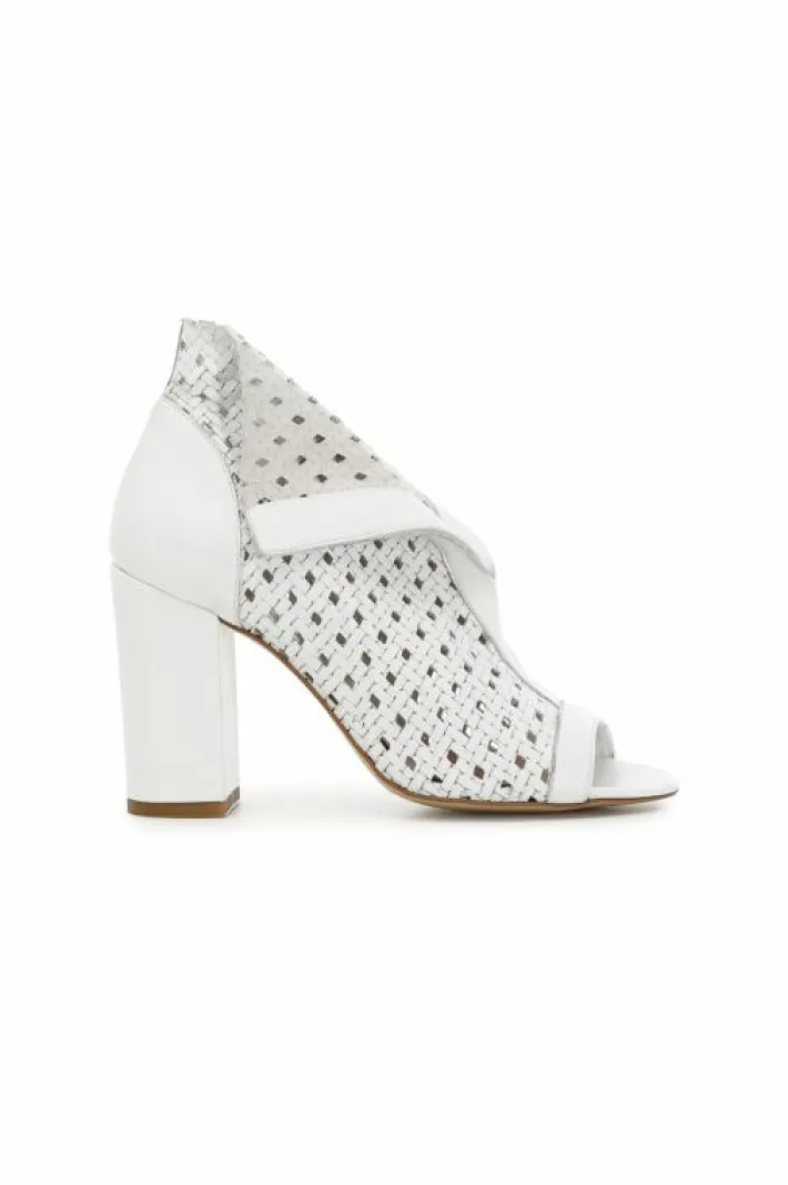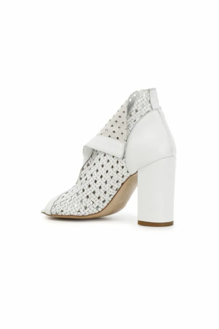 Tronchetti spuntati in pelle traforata, il leggero filo di metallo inserito nell’orlo della tomaia davanti permette una doppia vestibilità permettendo di piegare i lembi in avanti. Logo in metallo in vista o chiuso sulla scollatura a seconda di come si modellano.