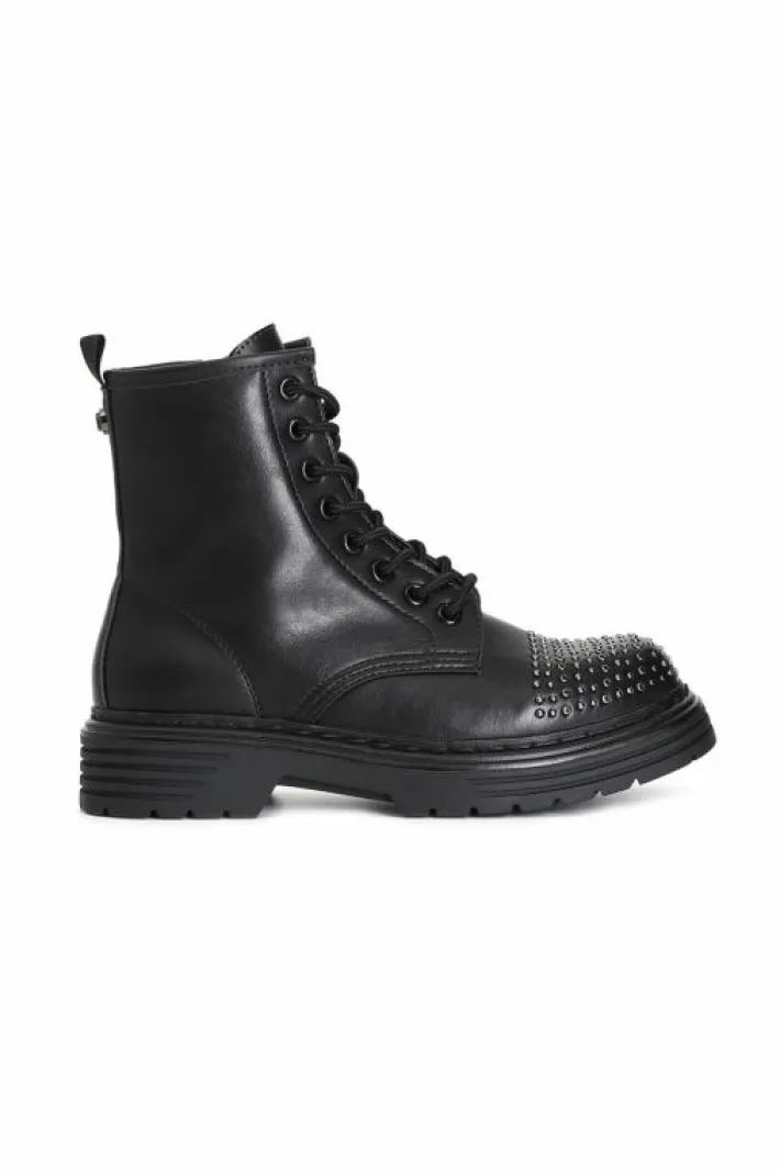 Prodotto iconico da sempre best seller indiscusso. questo tronchetto in similpelle allacciato con borchie ornamentali sulla punta. cerniera interna. nella sua semplicità è la chiave di volta per completare i look più svariati.