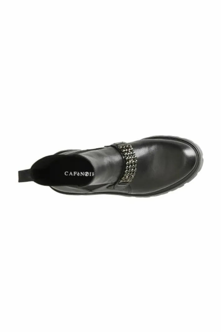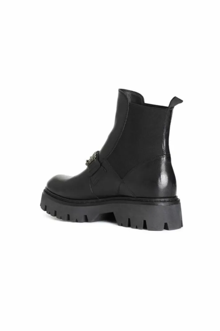 Tronchetto in pelle con elastico e accessorio gioiello. il soletto è in pelle. la suola carro armato in materiale extralight slancia la modelleria e la rende iper attuale.