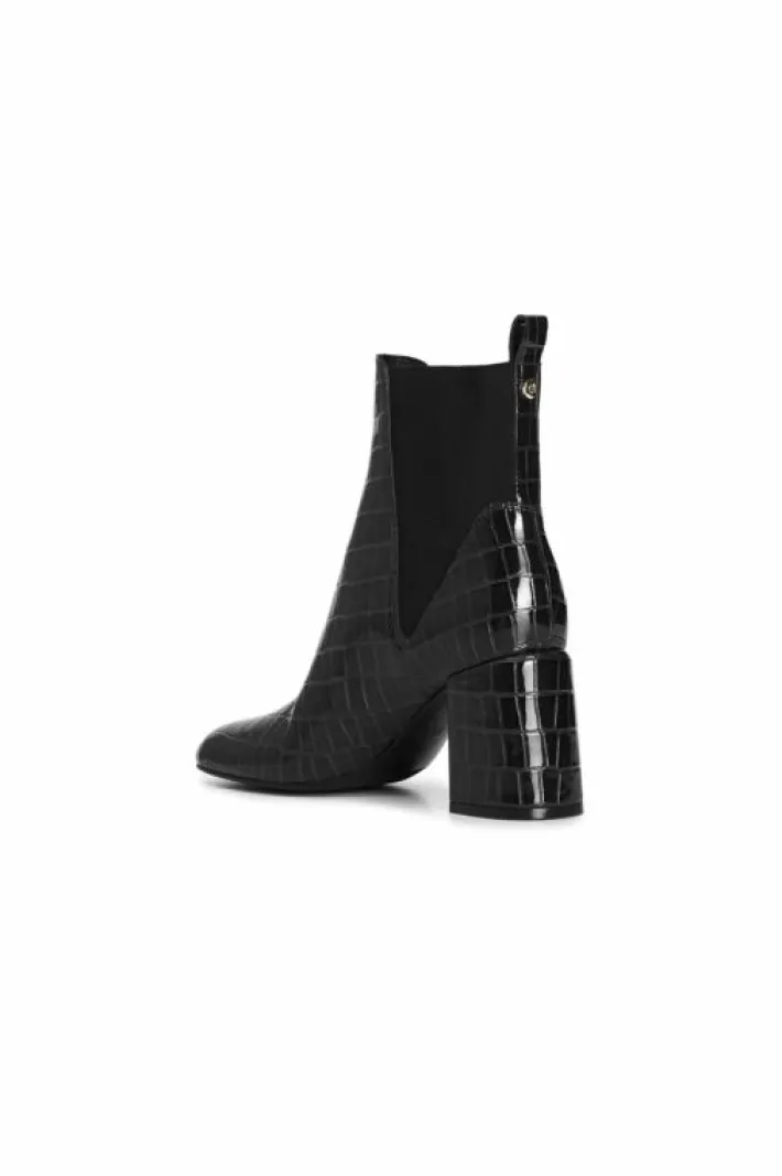 Tronchetto da donna con elastici in stampa effetto cocco. tacco fasciato alto 80 mm. il soletto è in pelle. ideale in abbinamento a molteplici look da mattina a sera.