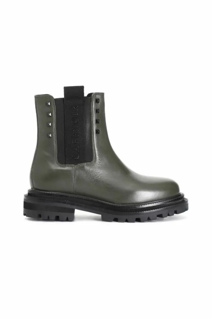 Tronchetto donna in pelle con elastico arricchito da un particolare nastro logato cafènoir e borchie di tendenza. il soletto è in pelle.