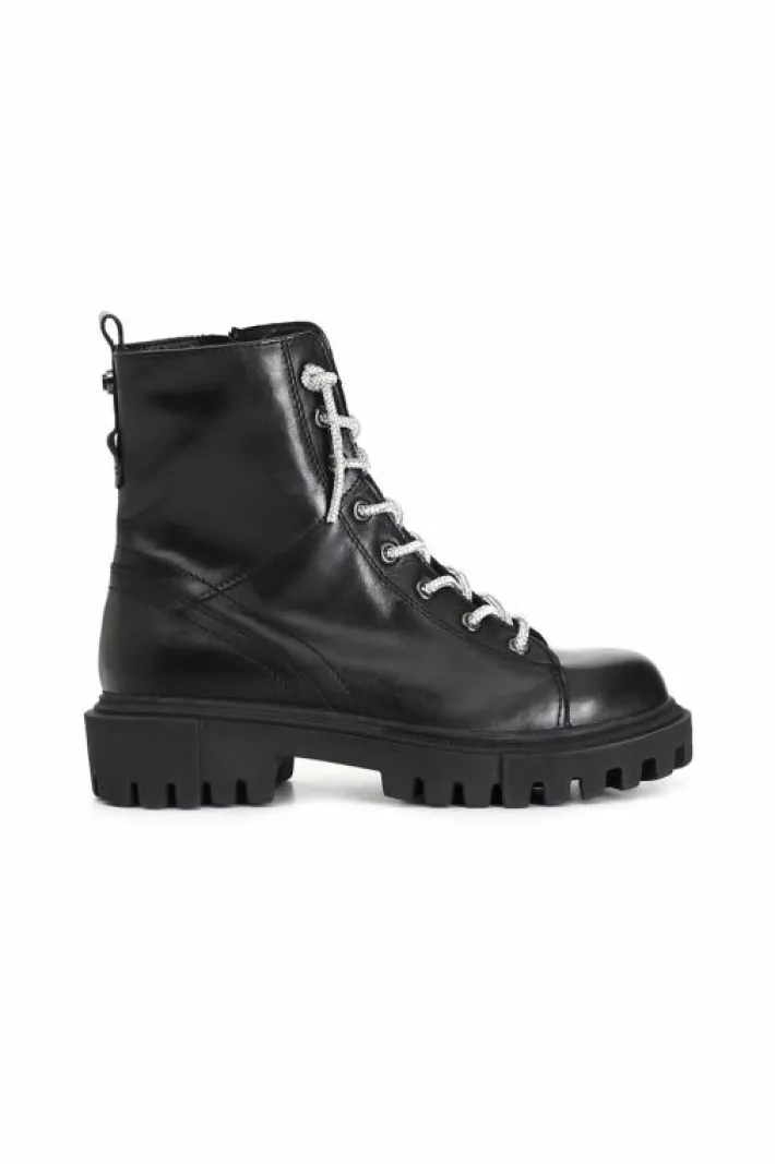 Tronchetto da donna in pelle con lacci fatti impreziositi da strass ultrabrillanti. il soletto è in pelle. la suola carro armato in materiale extralight slancia la modelleria e la rende iper attuale.