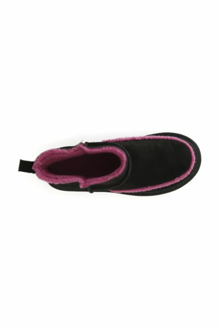 Tronchetto in pelle scamosciata con interno in pelliccia sintetica arricchito da un simpatico inserto a contrasto.