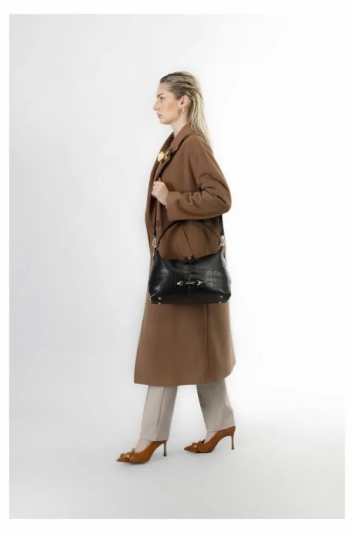 Sacca in materiale sintetico stampa cocco. applicazione di tag con lettering in metallo. chiusura con cerniera. tasca interna con zip. tracolla removibile.