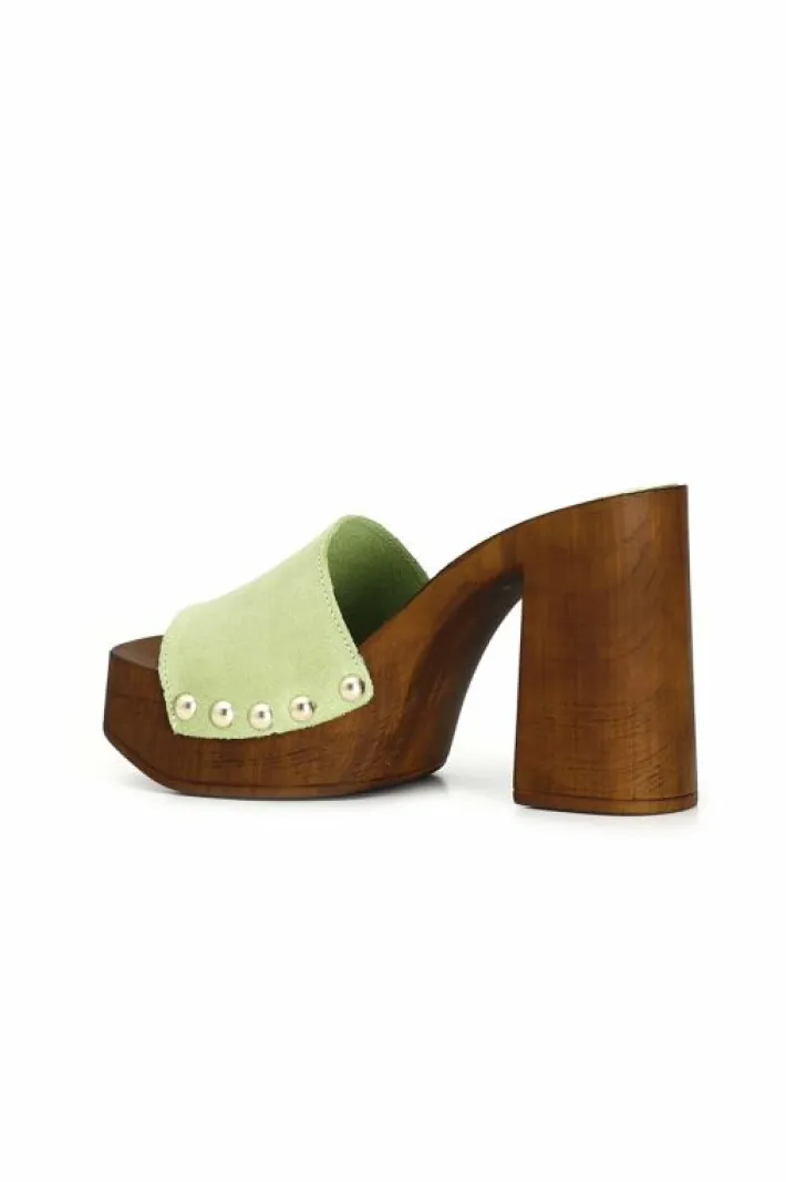 Zoccoli con fascia in crosta disponibile in 6 colori. plateau e tacco in legno scuro e sottopiede in suede che riprende il colore della fascia.