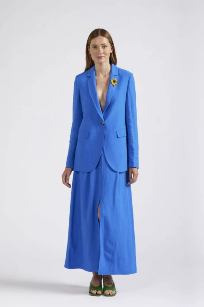 Giacca monopetto realizzata in un fresco tessuto misto lino. la giacca è impreziosita da un delicato accessorio removibile a forma di fiore lavorato a crochet. chiusura con un bottone dotato e tasche a filetto con pattina.