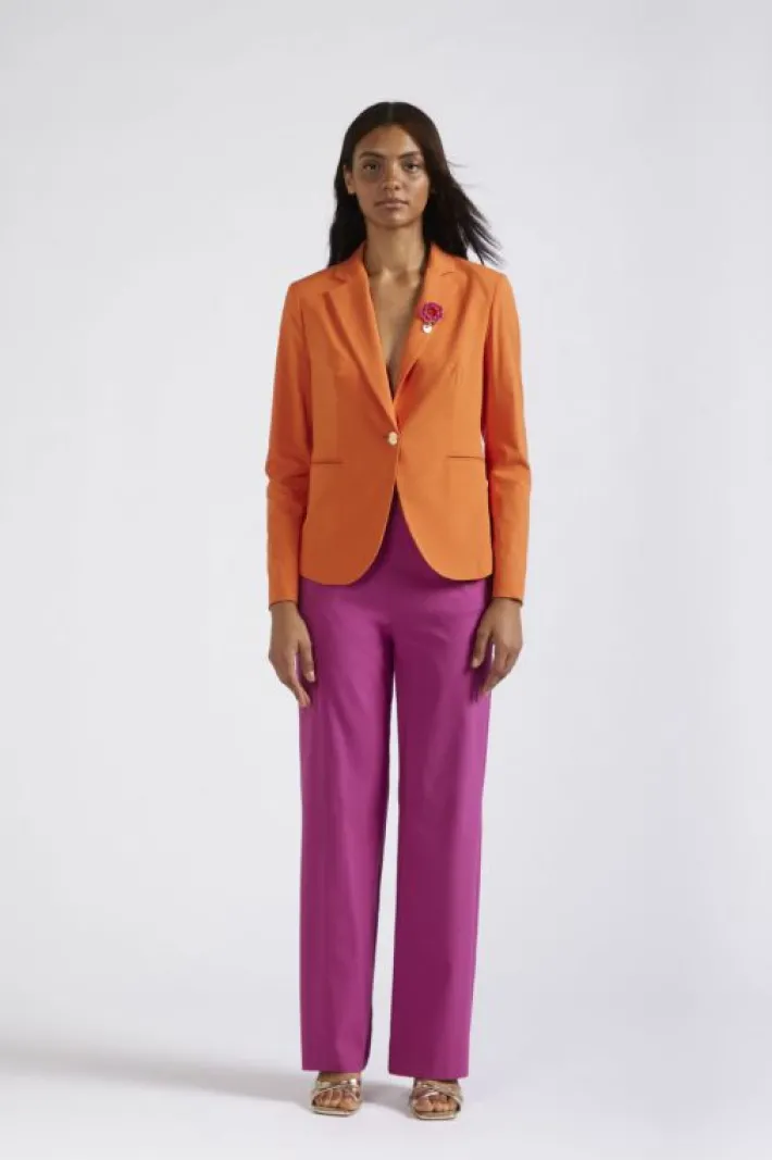 Intramontabile giacca monopetto in tessuto superstretch dall’effetto fiammato. il colletto è arricchito da un accessorio a fiore removibile lavorato a crochet. chiusura con un bottone dotato e tasche a filetto.
