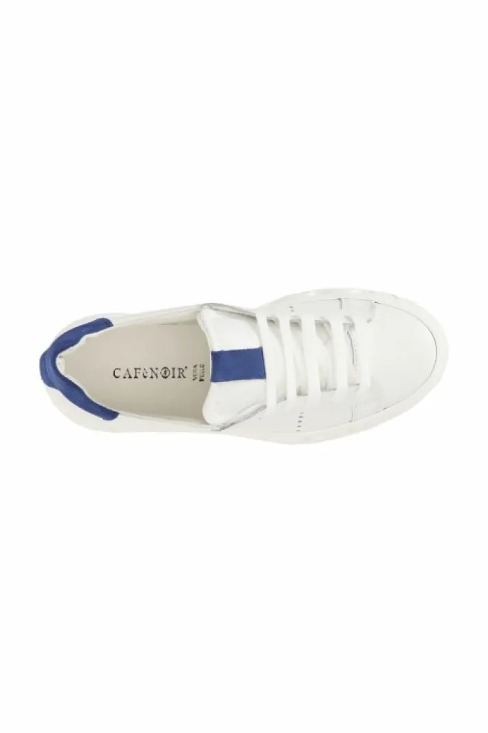 Sneakers allacciate uomo in pelle bianca con colletto blu. soletto in pelle.