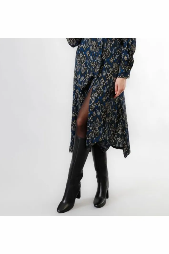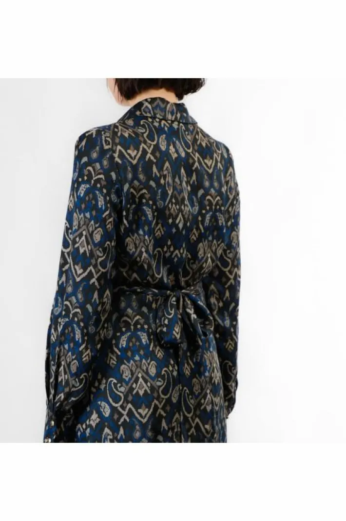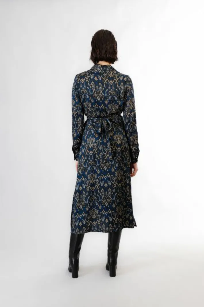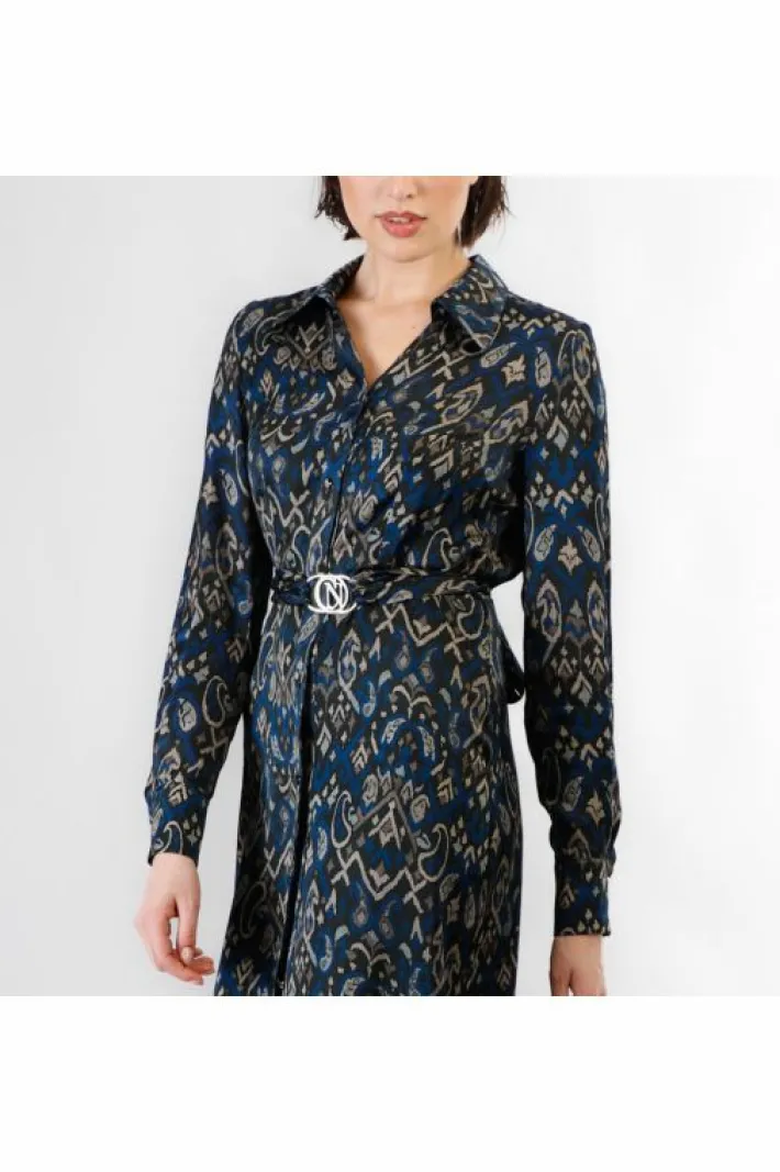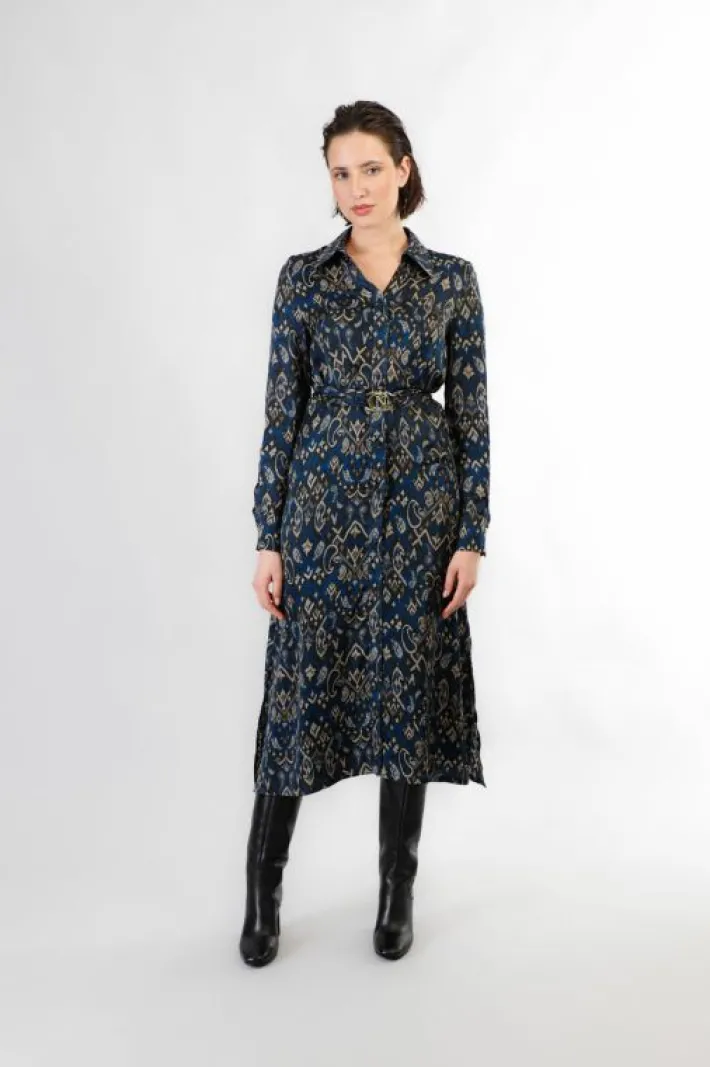 Abito modello chemisier in viscosa stampata. il capo è a maniche lunghe e spacchi laterali. chiusura frontale con bottoni a vista. la sua vestibilità morbida non segna la silhouette. delineato il punto vita grazie alla fusciacca in tessuto con fibbia logata cafènoir.