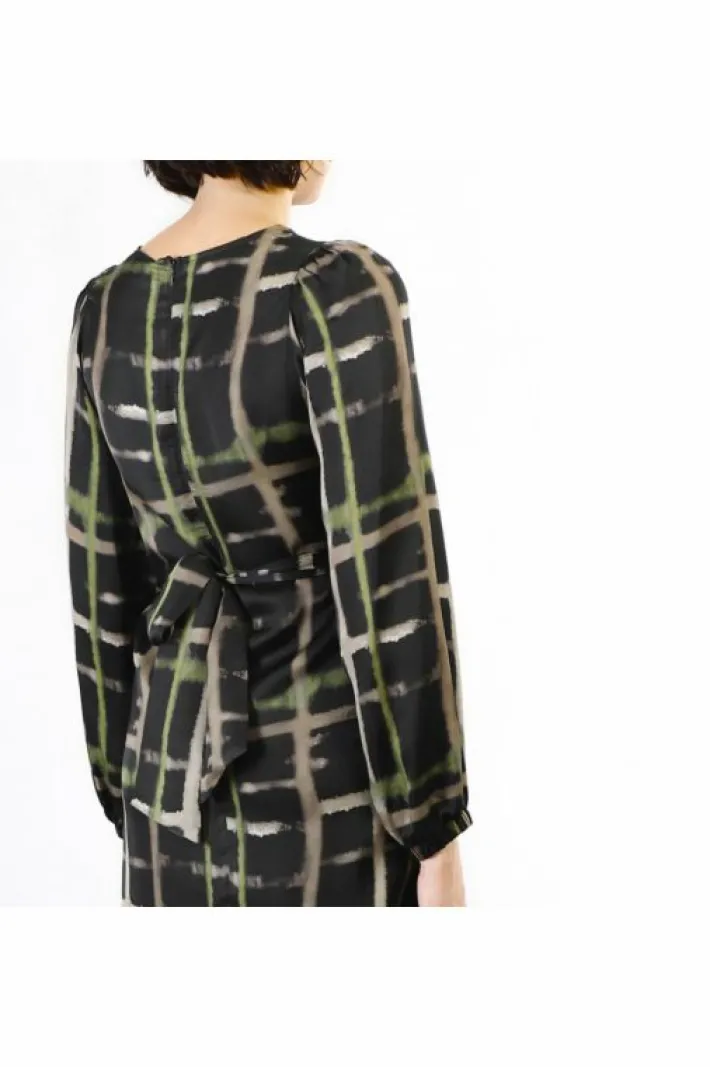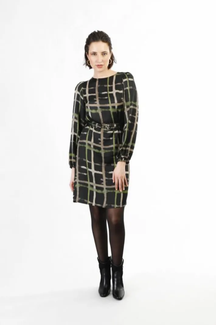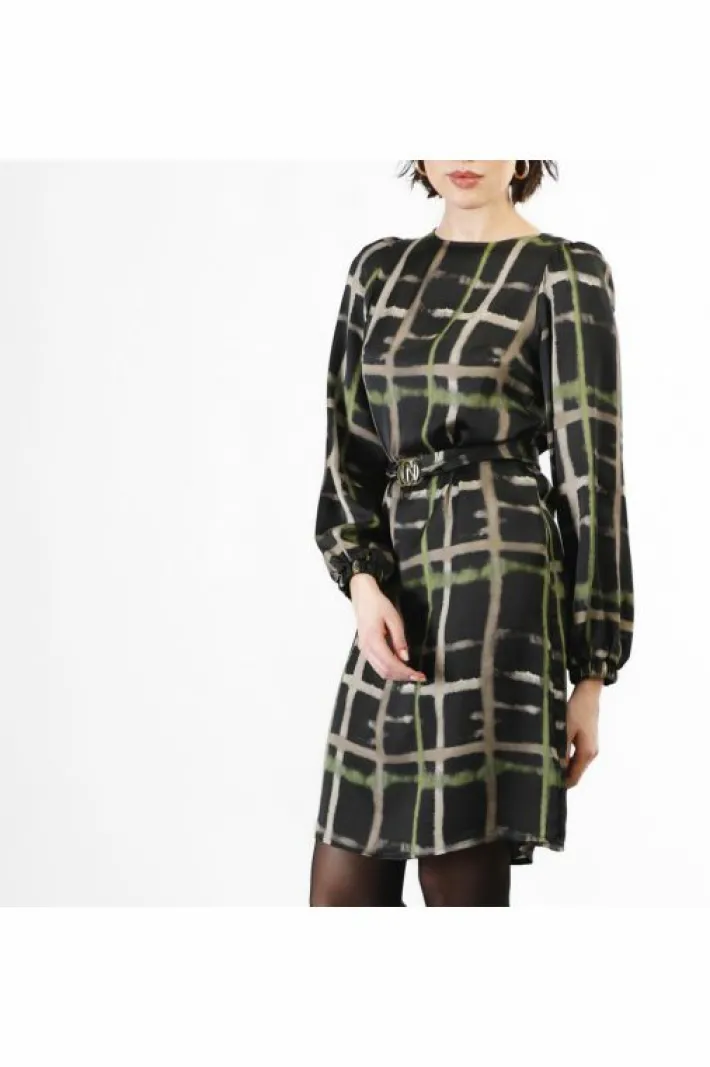 Abito dalla linea dritta in viscosa stampata. maniche lunghe morbide con bottoni sui polsi. delineato il punto vita grazie alla fusciacca in tessuto con fibbia logata cafènoir. chiusura con zip invisibile sul retro.