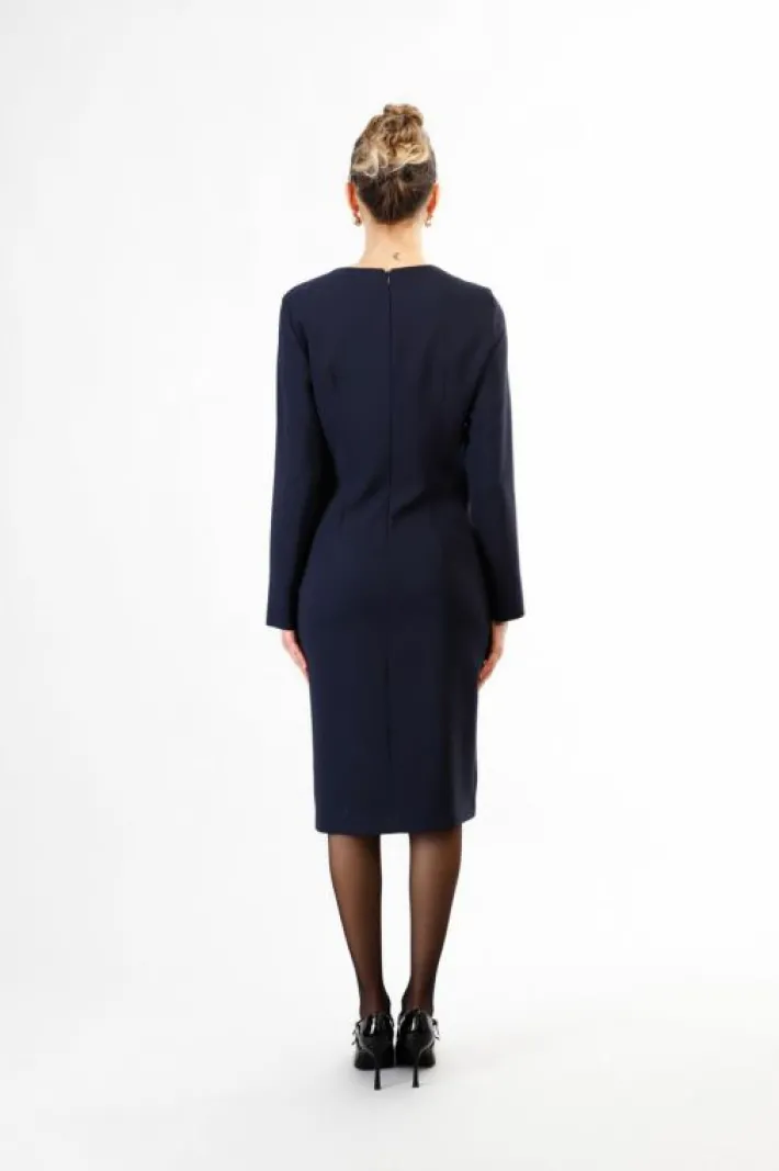 Abito girocollo modello tubino e motivo di finto portafoglio con dettaglio personalizzato a rifinitura. il capo è a maniche lunghe e realizzato in tessuto bistretch. chiusura posteriore tramite zip a scomparsa. abito semplice e versatile perfetto per l’ufficio femminile e nello stesso tempo pratico da tenere sempre nel tuo guardaroba.