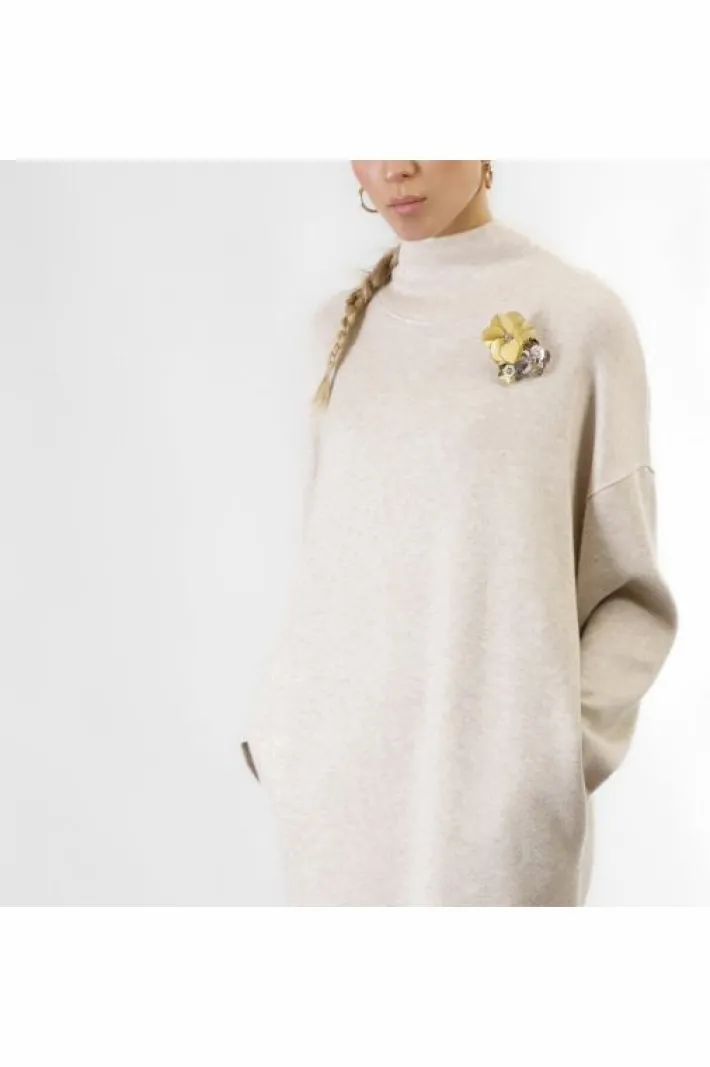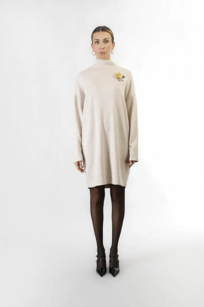 Abito in felpa dalla mano calda. collo alto e applicazione a fiore sulla parte frontale dell’abito. tasche laterali. capo estremamente comodo funzionale e di tendenza.