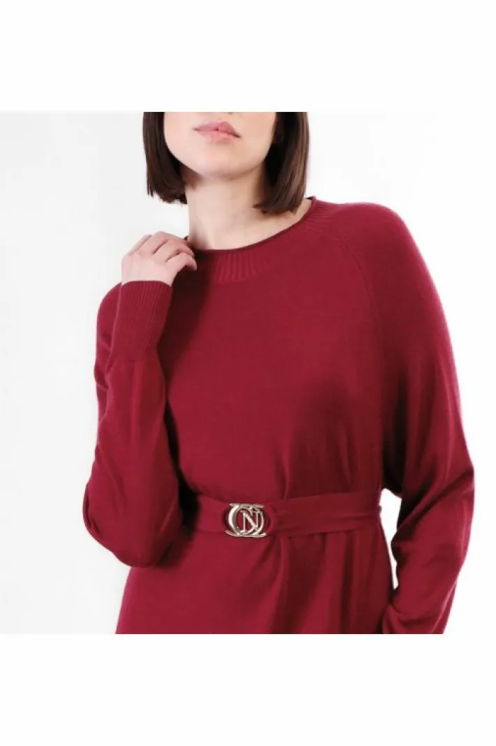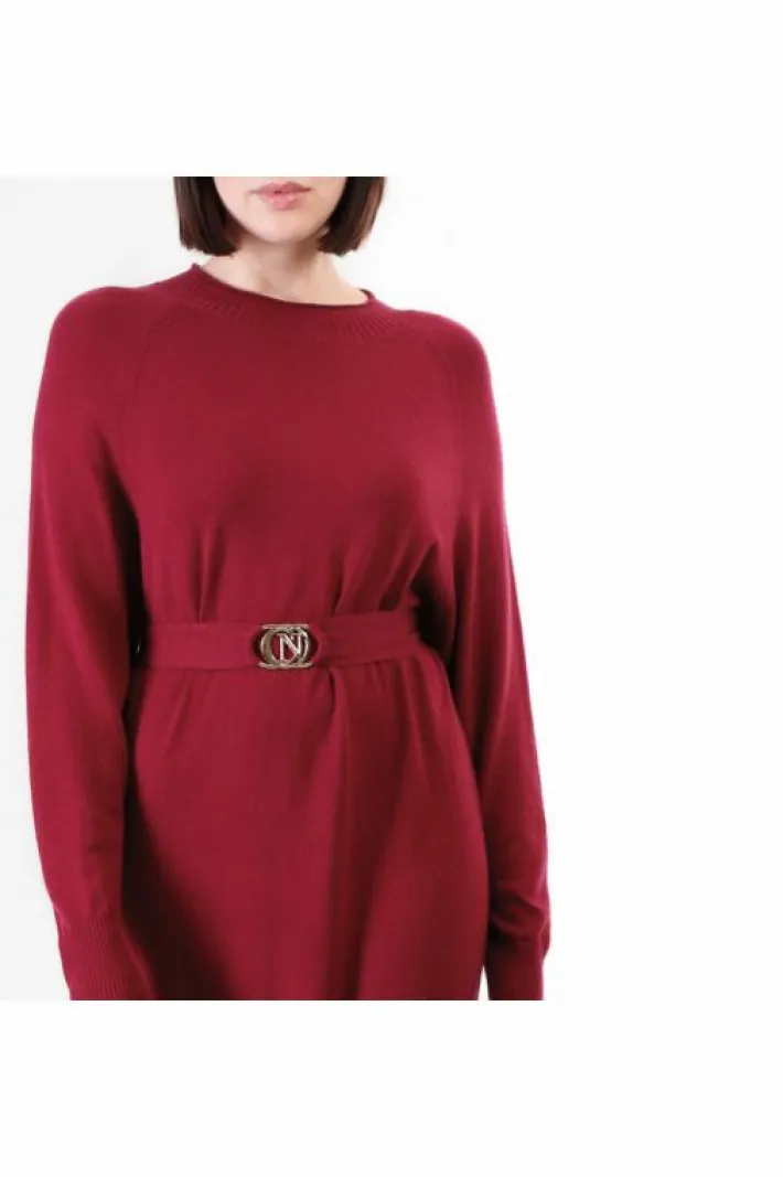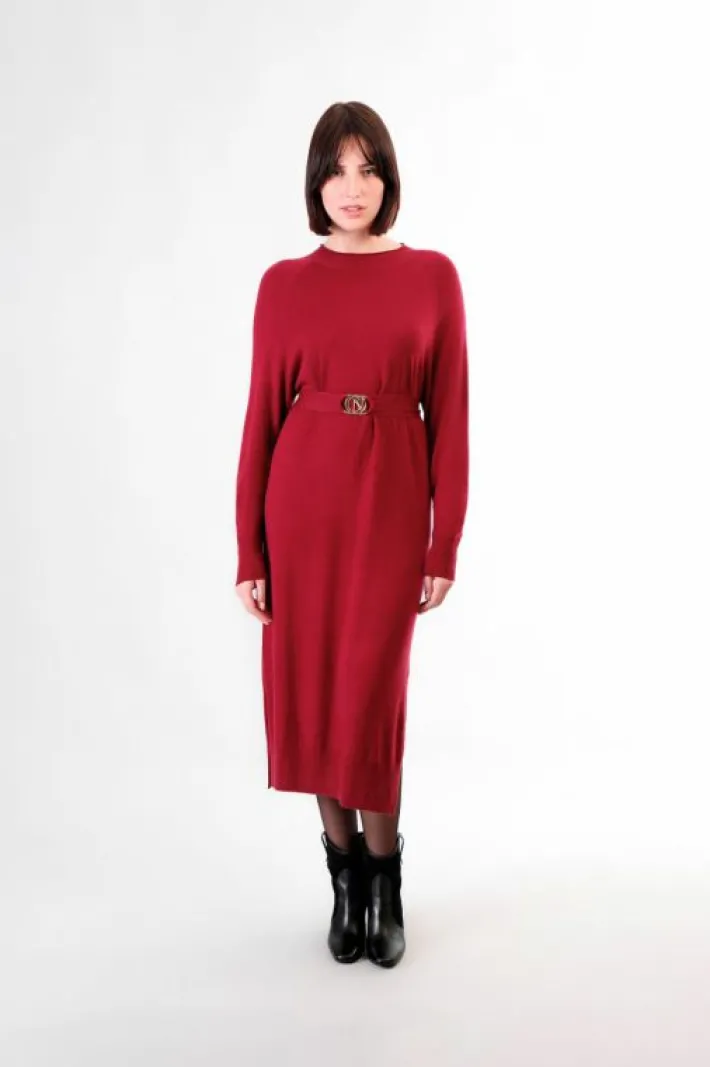 Abito in maglia girocollo. realizzata in filato misto cashmere. lunghezza al polpaccio spacchi laterali e cintura con fibbia logata. perfetto per essere indossato con qualunque abbinamento.