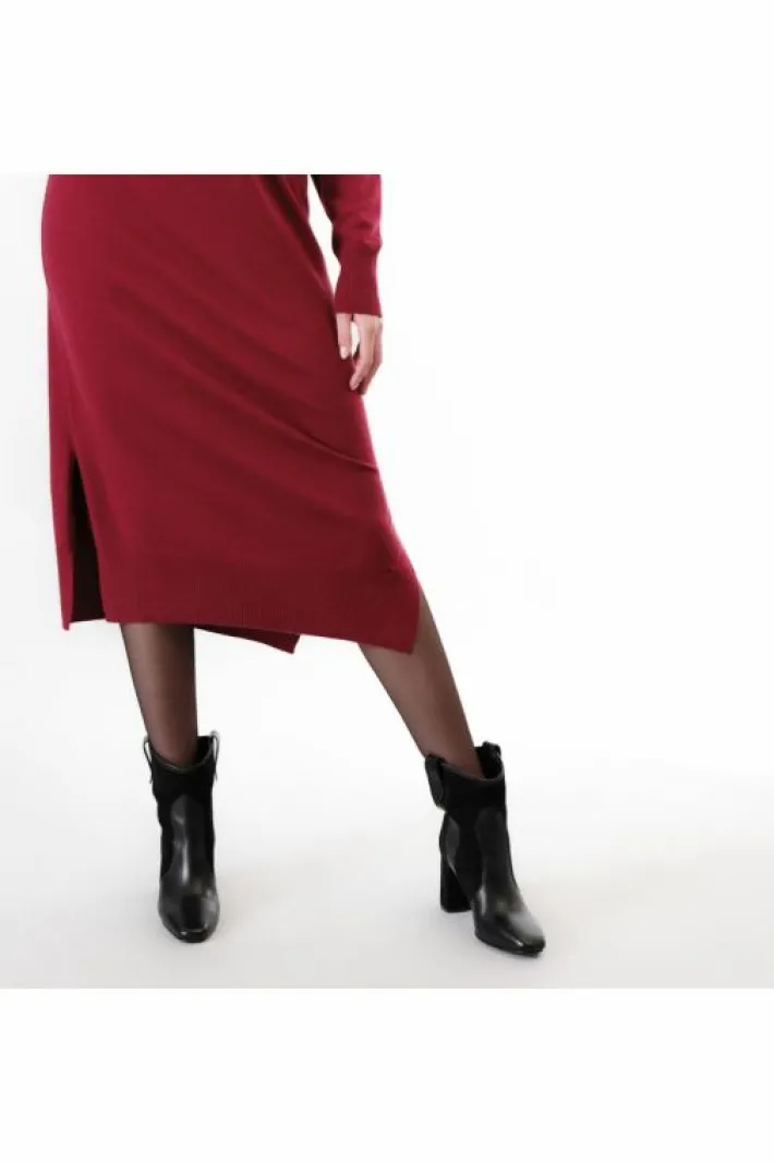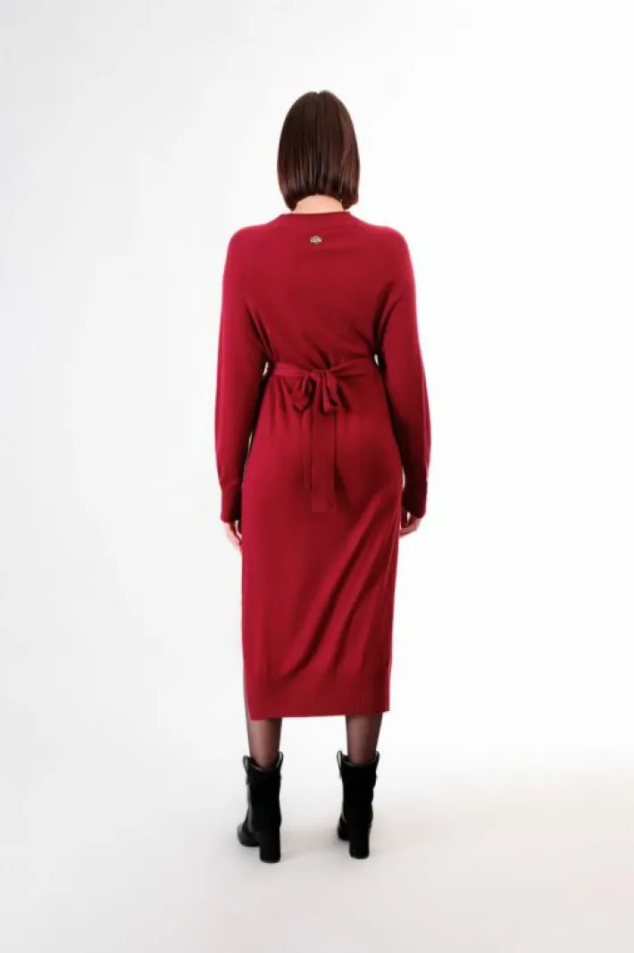 Abito in maglia girocollo. realizzata in filato misto cashmere. lunghezza al polpaccio spacchi laterali e cintura con fi…