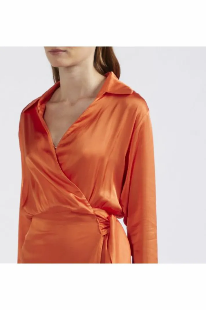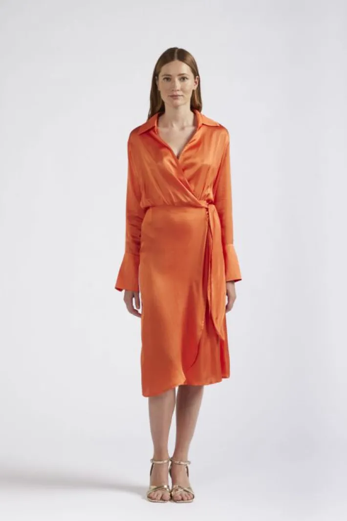 Elegante abito portafoglioo con maniche lunghe realizzato in un leggero satin di viscosa. collo a “v”. abito perfetto per un look da cerimonia.