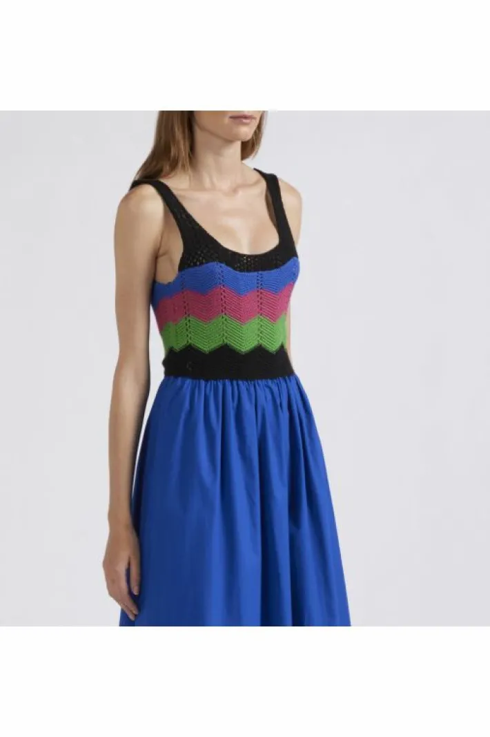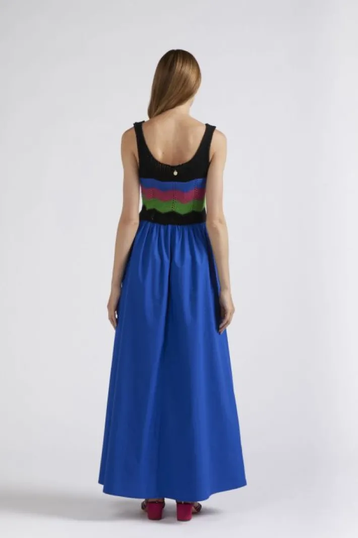 Abito lungo smanicato. il top è smacchinato con un filato misto cotone lavorazione crochet multicolor. la gonna è realizzata in popeline di cotone.