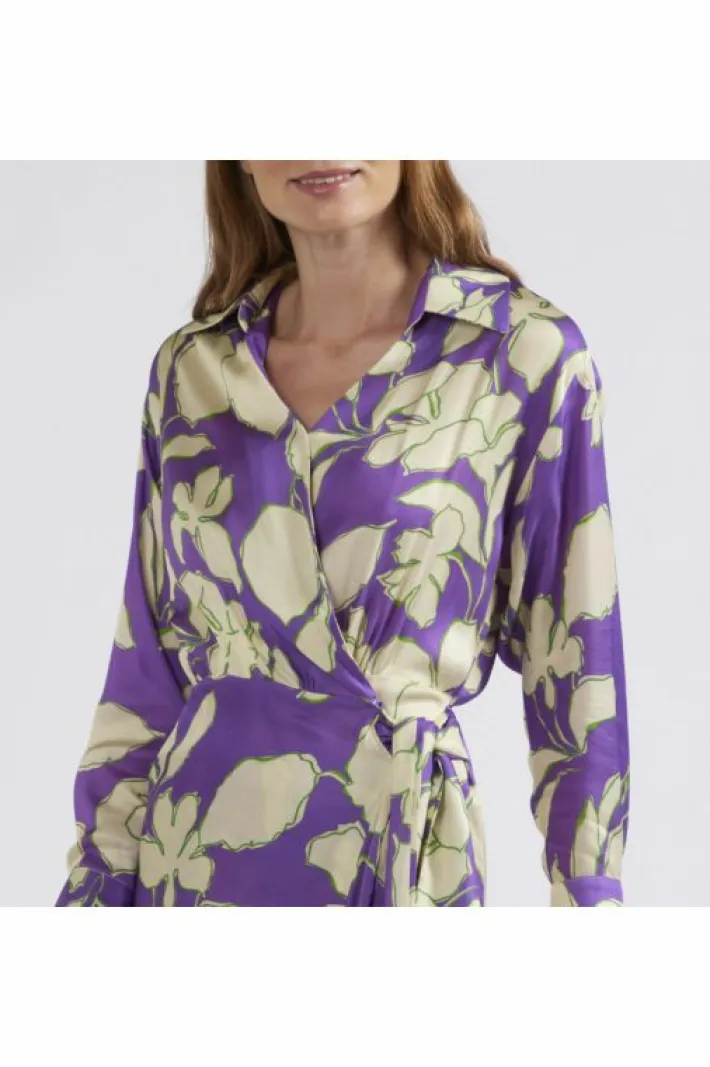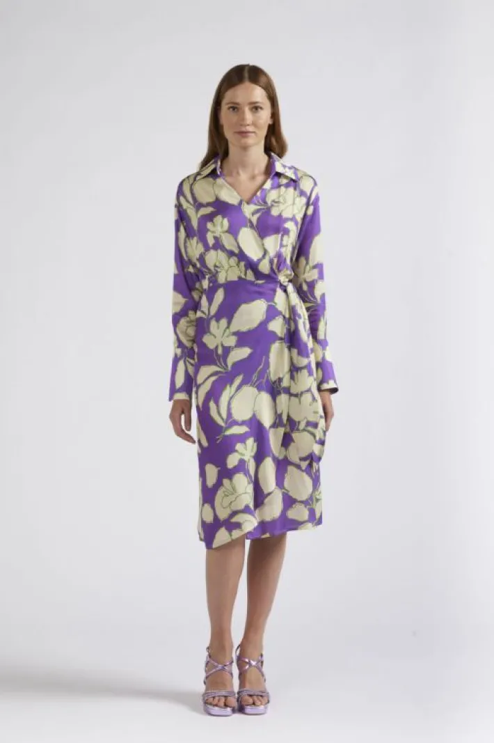 Elegante abito portafoglioo con maniche lunghe realizzato in un leggero satin di viscosa stampata. collo a “v”. abito perfetto per un look da cerimonia.