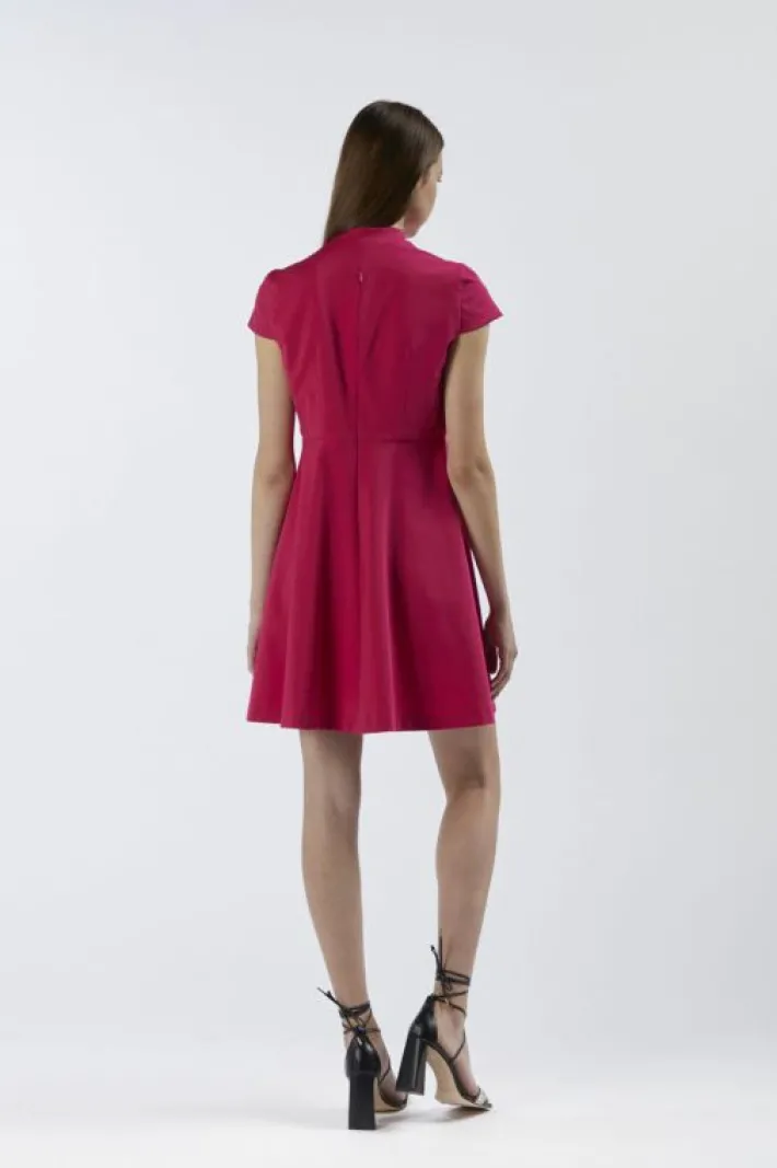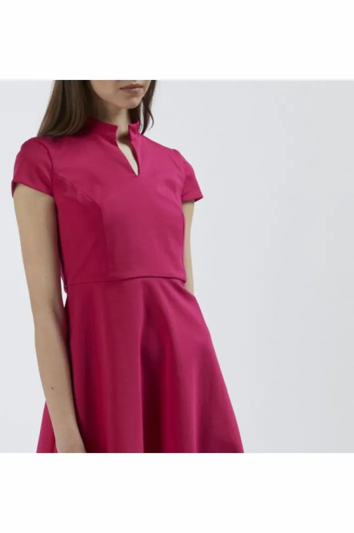 Abito mezza manica con taglio in vita e linea svasata realizzato in tessuto elasticizzato. collo alla coreana. un capo perfetto sia per il giorno sia per la sera.