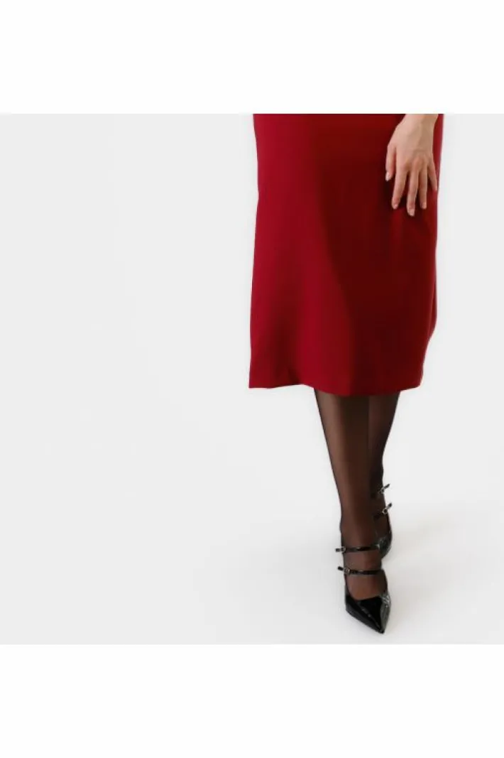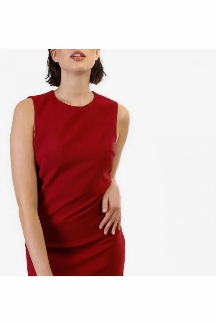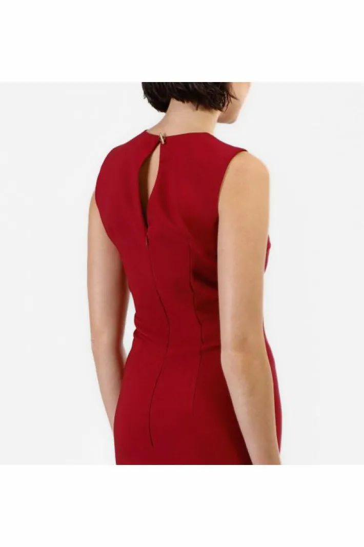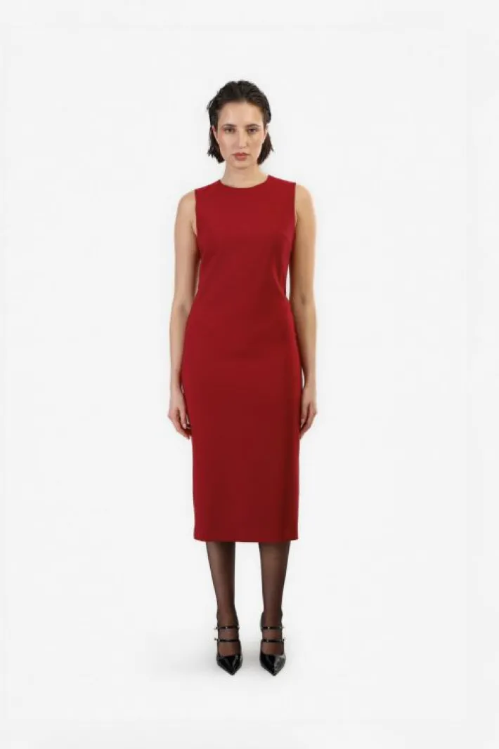 Abito girocollo modello tubino lunghezza sotto il ginocchio.l’abito è smanicato e realizzato in tessuto bistretch. sul retro è presente un’apertura a goccia con accessorio dorato e chiusura posteriore tramite zip a scomparsa. piccolo spacco posteriore centrale. il capo ha un vestibilità aderente che valorizza la silhuoette perfetto per l’ufficio.