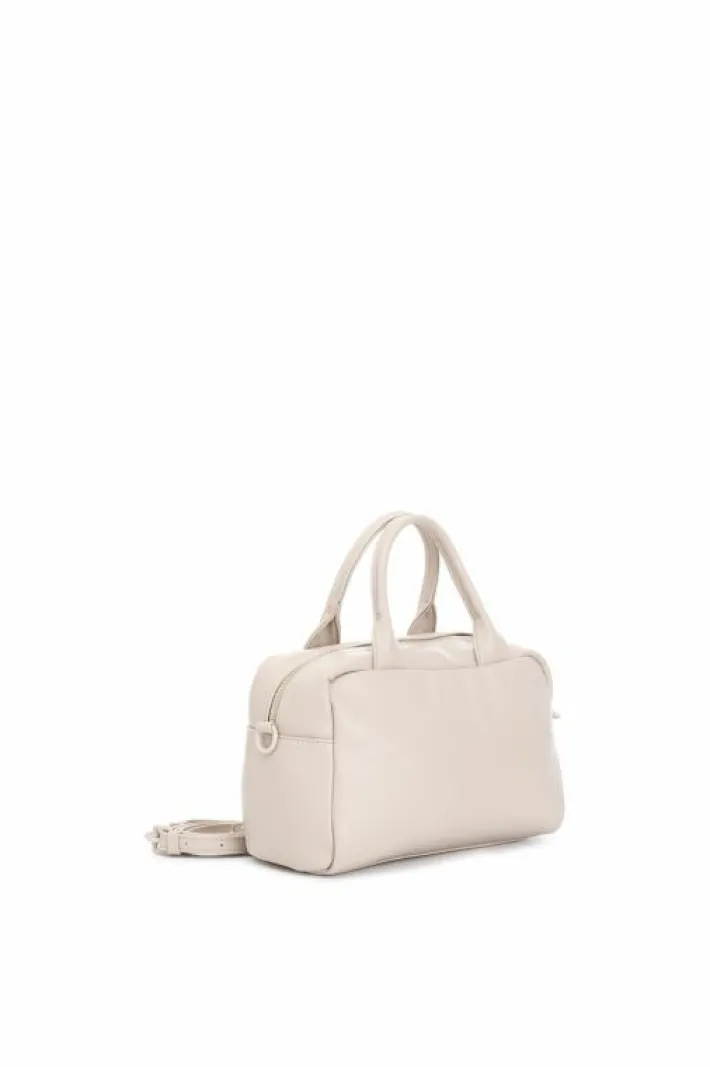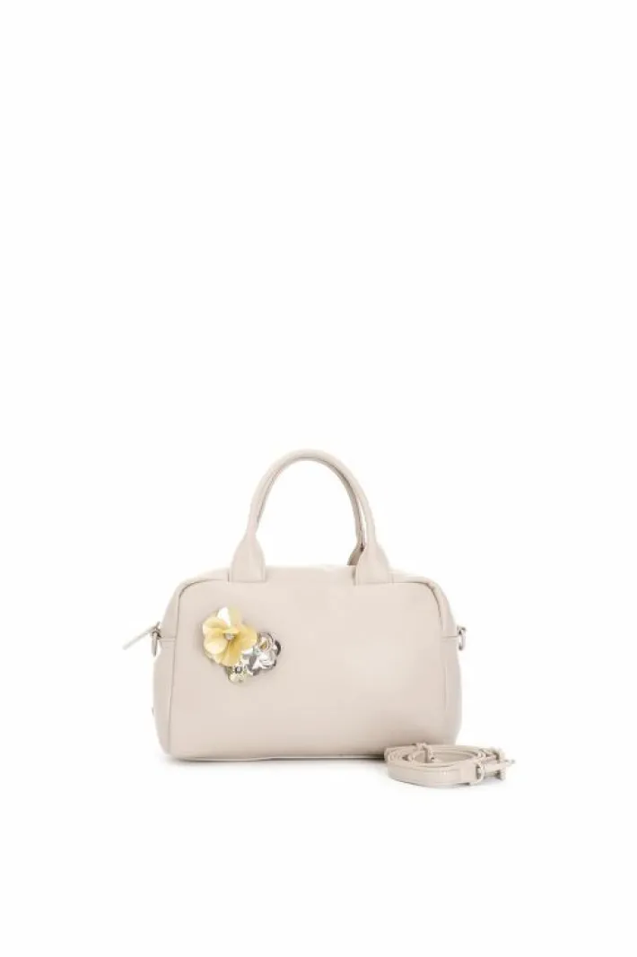 Bauletto a mano in materiale sintetico liscio imbottito effetto puffy con applicazione di fiori in paillettes. borsa provvista di unico scomparto di un taschino interno con zip. chiusura con cerniera. borsa dotata di tracolla.