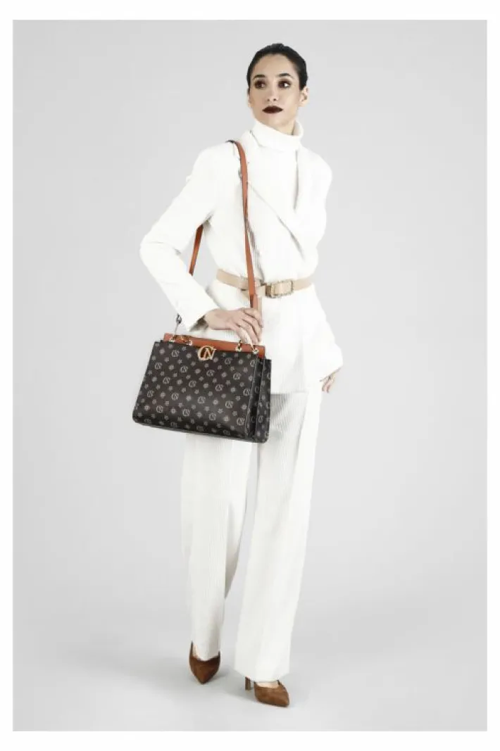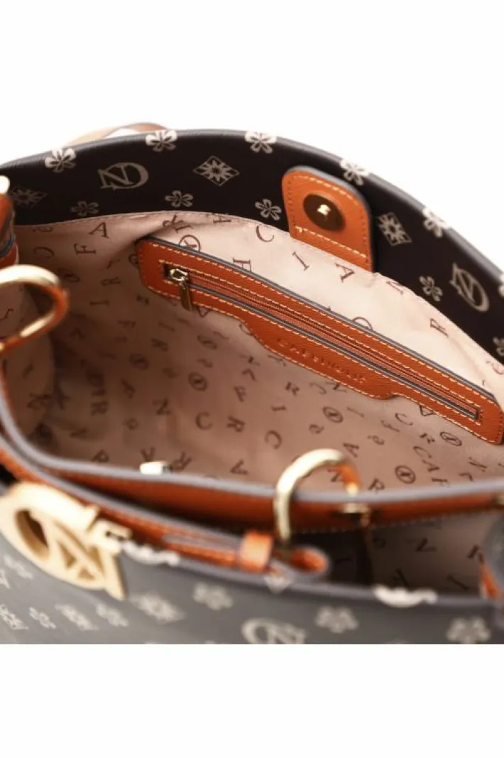 Bauletto in materiale effetto saffiano con stampa logata floreale all over, tramezza e manici in colore a contrasto e accessorio CafèNoir a incastro sul quadrante anteriore