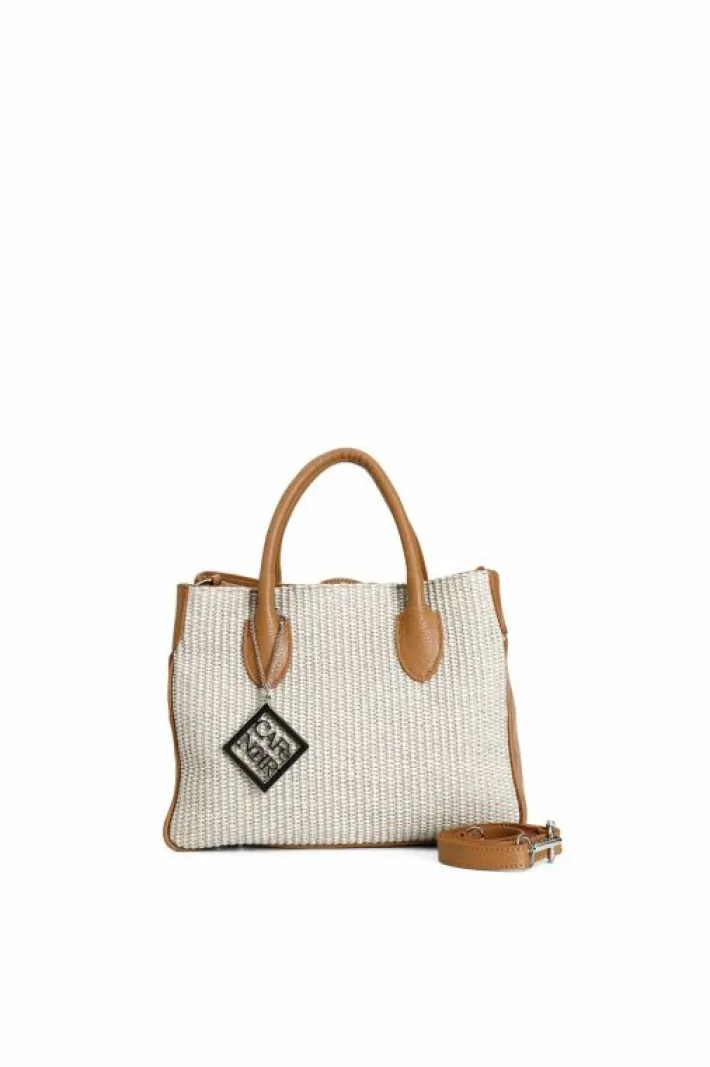 Bauletto in rafia chiuso con pattina con rifiniture in pelle. ciondolo quadrato in metallo con logo. manici tubolari e tracolla.