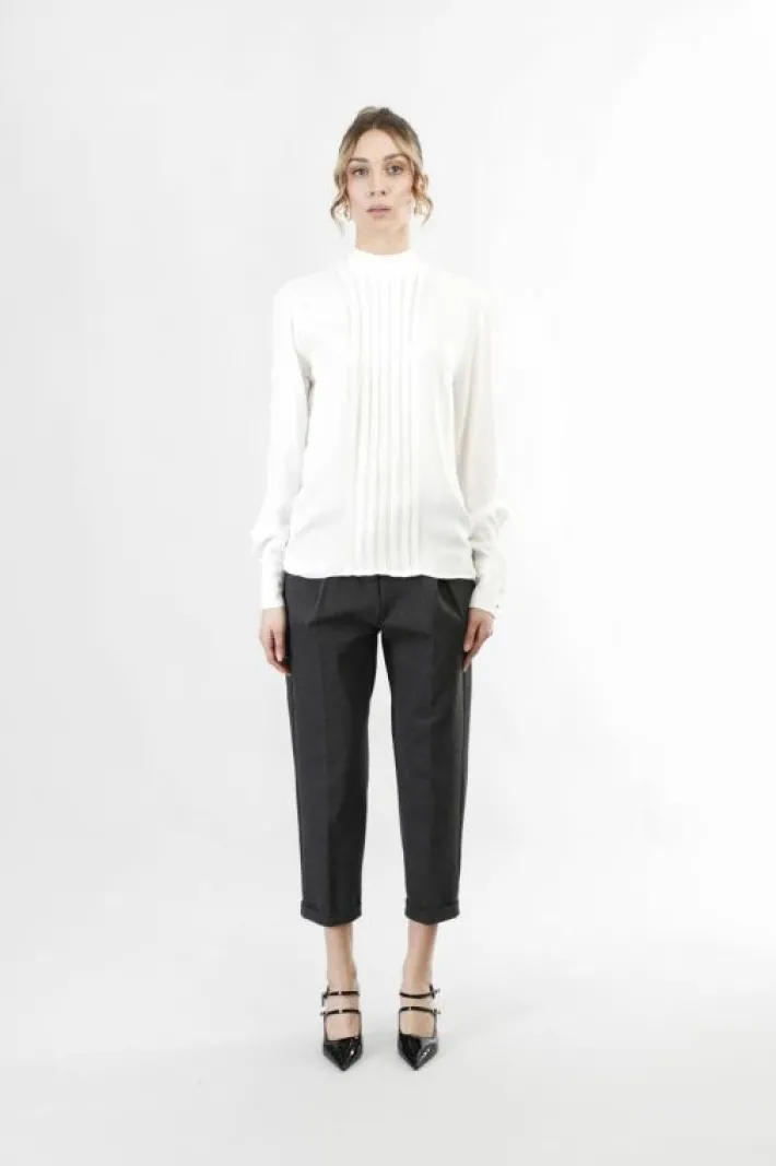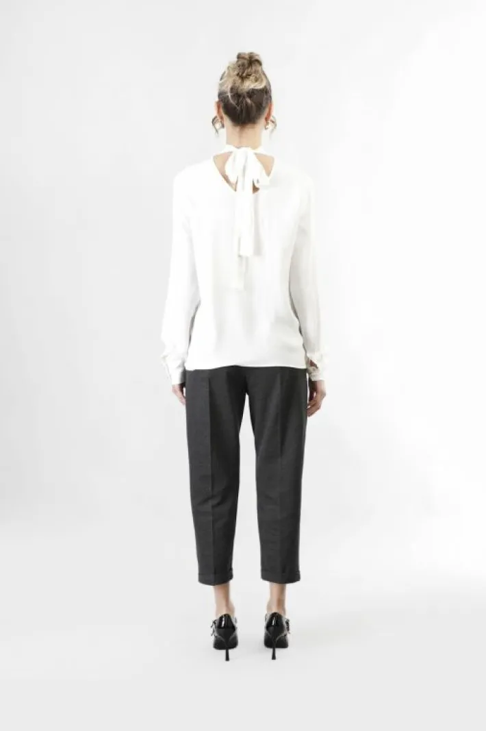Blusa girocollo a maniche lunghe con motivo di pieghe sul davanti. fusciacca al collo con nodo sul retro. realizzata in …
