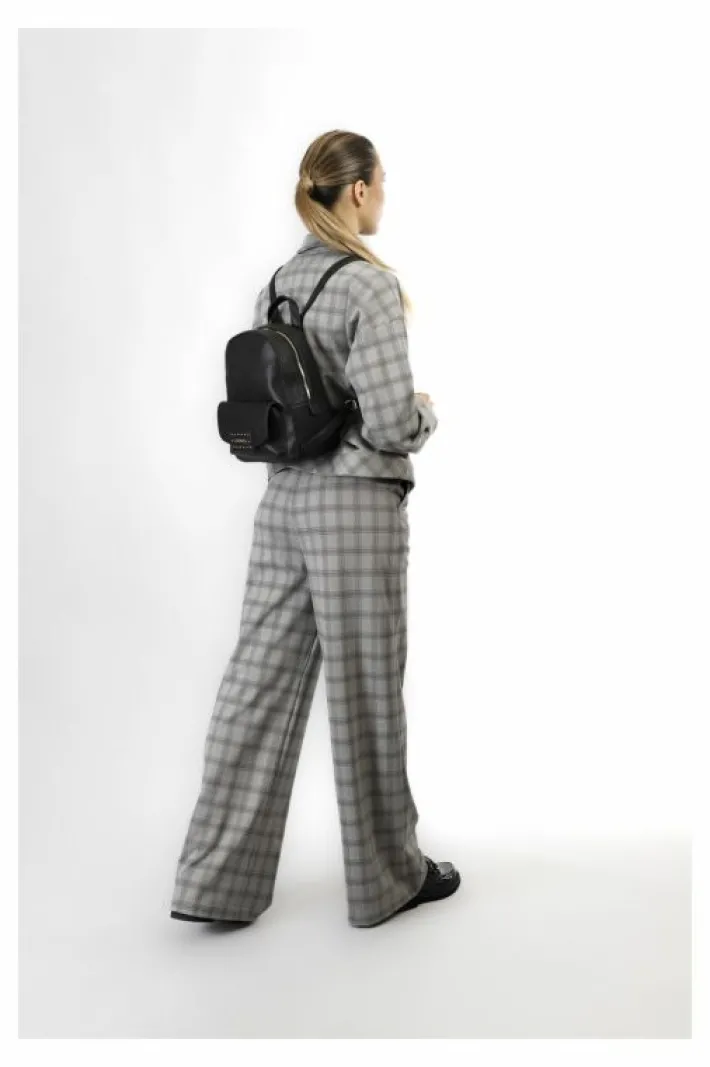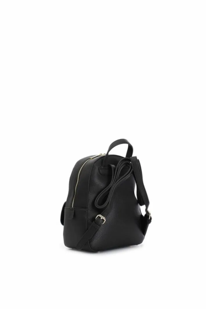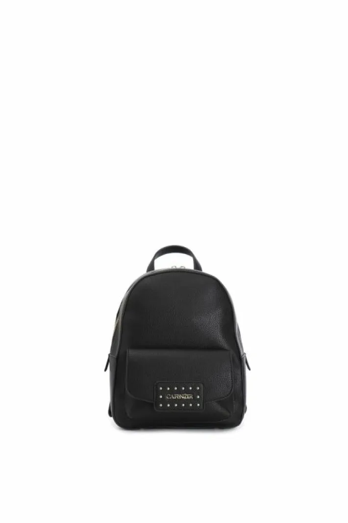 Zaino in materiale sintetico con tasca frontale con applicazione di logo e rivetti. doppia apertura con cerniera in testa. spallacci regolabili.